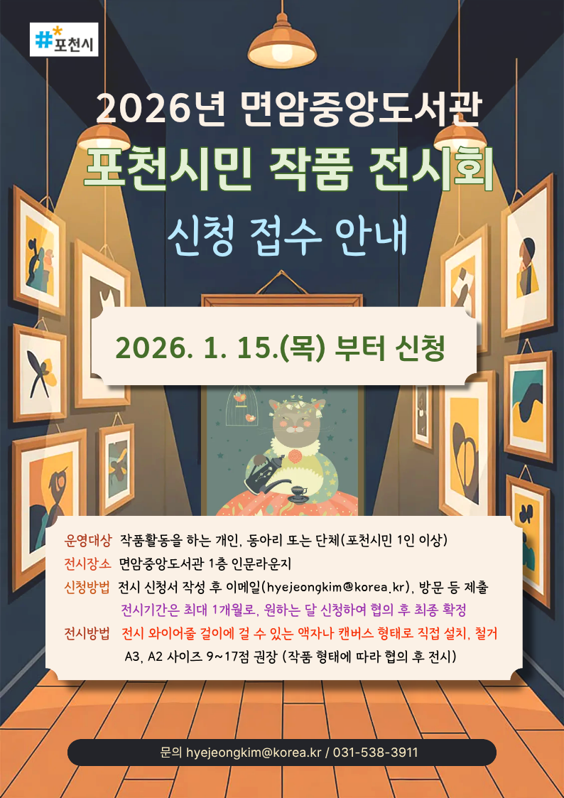 2026년 면암중앙도서관 포천시민 작품 전시회 신청 안내 중앙도서관 1층 라운지에 시민작품 전시 공간을 운영하오니, 작품활동을 하는 포천시민들의 많은 관심 부탁드립니다.~ ○ 운영대상: 시민작가, 아마추어 개인, 동아리 등의 단체(포천시민 1인 이상) ○ 전시장소: 면암중앙도서관 1층 인문라운지 ○ 신청방법: 신청서 작성 후 이메일(hyejeongkim@korea.kr), 방문 등 제출 (전시기간은 최대 1개월로, 원하는 달 신청하여 협의 후 최종 확정) ○ 전시수량: A3, A2 사이즈 등 9~17점 전시 가능, 벽에 걸수 있도록 표구된(액자형태, 캔버스 형태 등) 가벼운 작품 환영 ○ 전시방법: 확정된 기간의 시작일에 개시, 종료일에 철거(날짜 조정가능), 직접 전시하고 철거 해야합니다. * 빈서식에 신청서 작성 부탁드립니다. 예시는 참고용이며, 1.15.(목)부터 신청 가능합니다. * 이름을 달리한 중복 신청은 삼가해 주시기 바랍니다. * 협의가 필요 없는 전시 확정은 포천시청 카카오톡 문자 드리겠습니다.