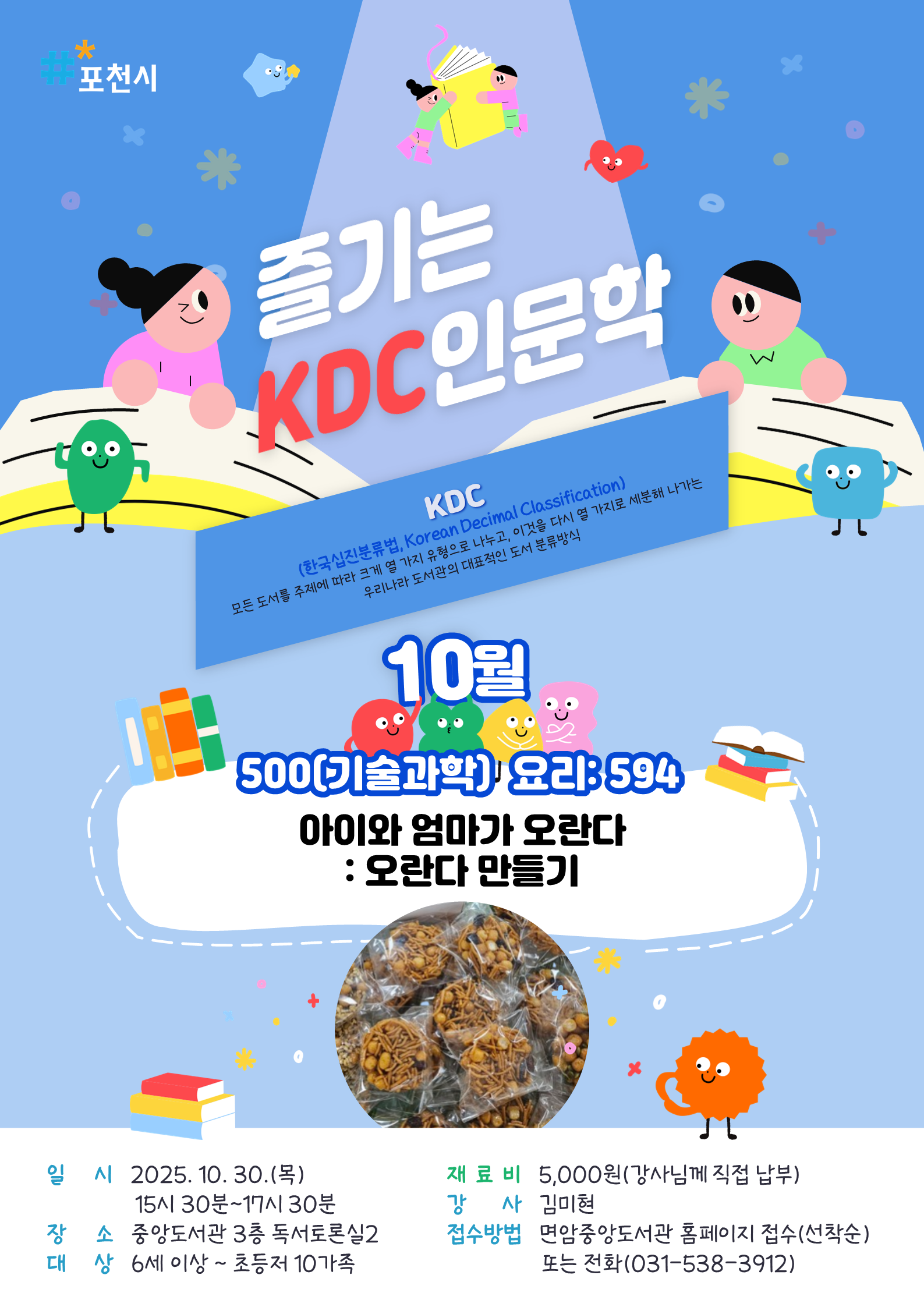 ![]() <2025년 중앙도서관 즐기는 KDC 인문학> KDC(한국십진분류법, Korean Decimal Classification) : 모든 도서를 주제에 따라 크게 열 가지 유형으로 나누고, 이것을 다시 열 가지로 세분해 나가는 우리나라 도서관의 대표적인 도서 분류방식 500번대(기술과학) #594 #요리 ○일시: 2025. 10. 30.(금) 15시30분~17시 30분 ○장소: 면암중앙도서관 3층 독서토론실2 ○대상: 6세~초등저 10가족 ○강사: 김미현 ○재료비: 5,000원(강사님 계좌로 직접 납부 / 아래 주의사항을 읽어주세요) ○접수방법: 면암중앙도서관 홈페이지 접수(선착순) *문의: 면암중앙도서관(031-538-3912) ※주의사항 -사전 연락 없이 당일 불참시, 다음 프로그램 참여가 2회 제한됨 -재료비가 있는 프로그램의 경우 >입금 후 환불 불가능 >사전 연락 없이 불참시, 재료 보관이 어려움 >사전 연락 후 불참시, 재료는 이주일 보관 후 폐기(데스크 수령). 다만 소분이 어려운 재료의 경우, 별도 보관이나 수령이 어려움 |