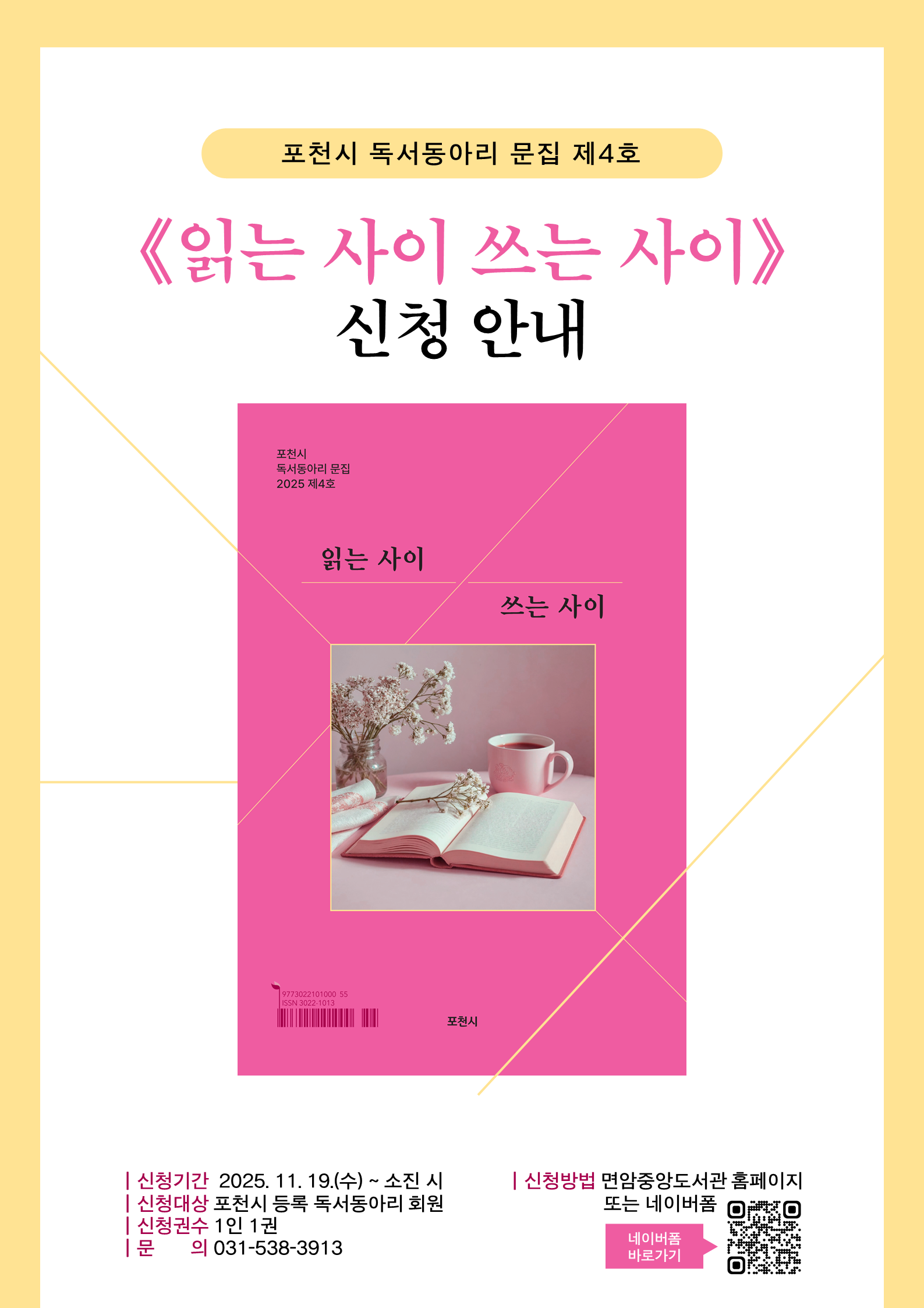 ![]() 독서동아리 문집 제4호 《읽는 사이 쓰는 사이》 신청 안내 ✅신청기간: 2025. 11. 19.(수) ~ 소진 시 ✅신청대상: 포천시 등록 독서동아리 회원 ※ 신규 등록 독서동아리 회원도 신청 가능 ✅신청권수: 1인 1권 ✅신청방법: 면암중앙도서관 홈페이지 또는 네이버폼 https://naver.me/GbAC8NtB ★ 신청 전 꼭 읽어주세요! ※ 포천시 등록 독서동아리 회원이 아닐 경우에는 신청 취소됩니다. ※ 비고에 동아리명과 수령 도서관(면암중앙, 소흘, 일동, 영북, 선단, 가산 中 택 1)을 꼭 작성해주세요. 미작성 시 면암중앙도서관으로 간주합니다. ※ 도서가 준비되면 문자로 안내드립니다. 문자를 받으신 후 도서관 방문해주세요. |