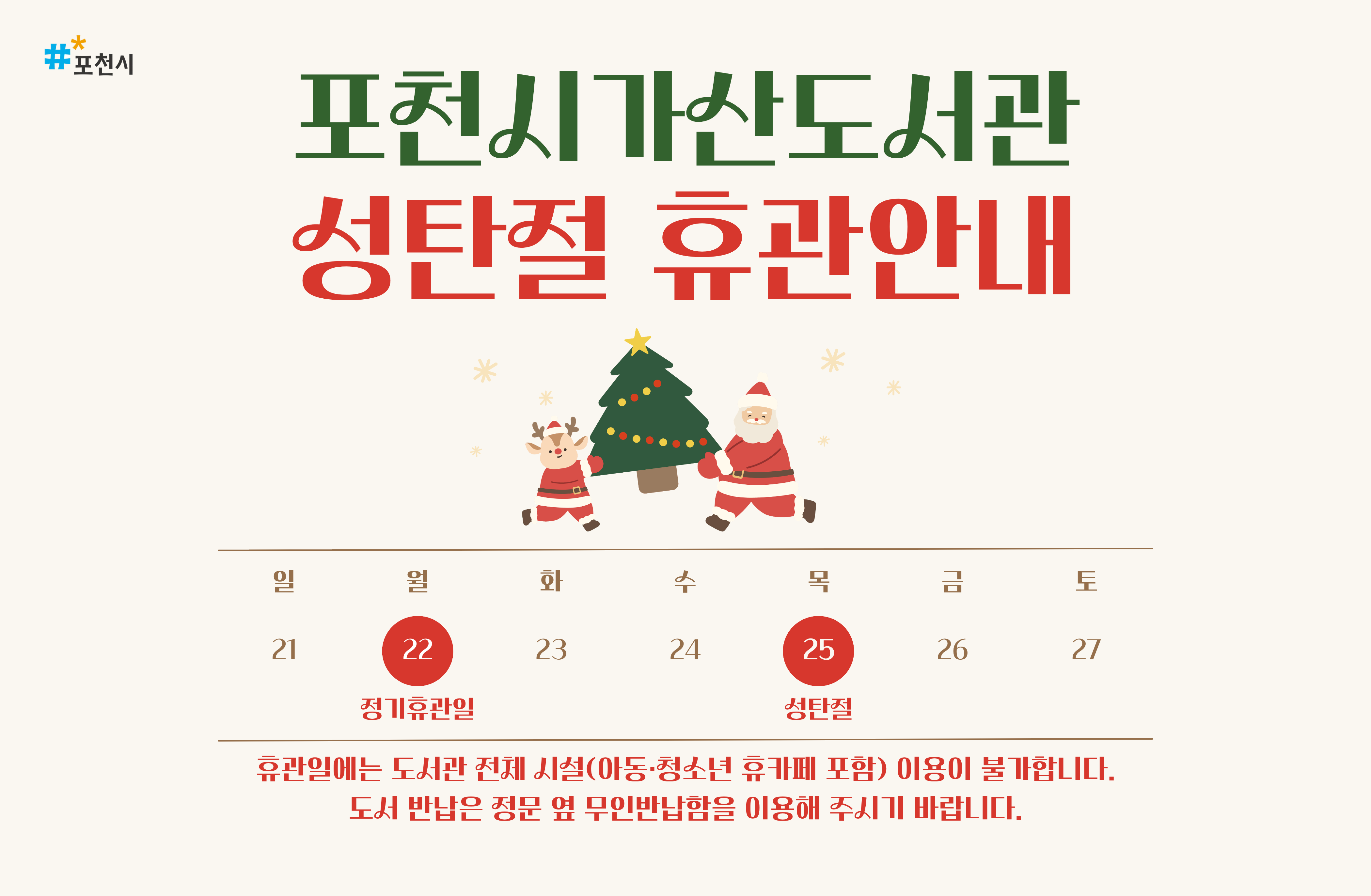 2025년 포천시도서관 성탄절(12월 25일 목요일) 휴관 안내 휴관일에는 도서관 전체 시설(아동•청소년 휴카페 포함) 이용이 불가합니다.