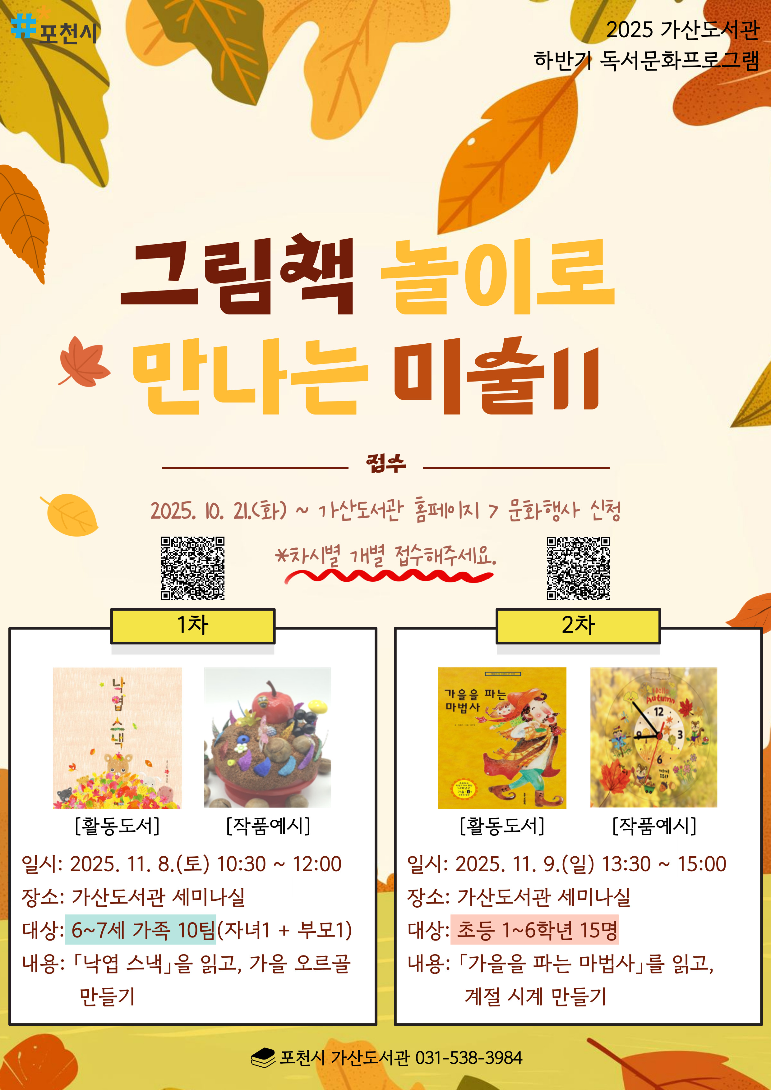 자녀 1 + 부모 1 신청해주세요.![]() 2025년 가산도서관 하반기 독서문화프로그램 《그림책 놀이로 만나는 미술 - 1차》 - 일시: 2025. 11. 8.(토) 10:30 ~ 12:00 - 장소: 가산도서관 세미나실 - 대상: 6~7세 가족 10팀(자녀 1 + 부모 1) - 내용: 「낙엽 스낵」을 읽고, 가을 오르골 만들기 - 문의: 031-538-3984 |