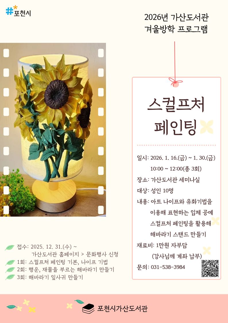 총 3회 수업입니다.![]() 2026년 가산도서관 겨울방학 프로그램 《스컬프처 페인팅》 - 일시: 2026. 1. 16.(금) ~ 1. 30.(금) 10:00 ~ 12:00(총 3회) - 장소: 가산도서관 세미나실 - 대상: 성인 10명 - 내용: 아트 나이프와 유화기법을 이용해 표현하는 입체 공예인 스컬프처 페인팅을 활용해 해바라기 스탠드 만들기 · 1회: 스컬프처 페인팅 기본, 나이프 기법 · 2회: 행운, 재물을 부르는 해바라기 만들기 · 3회: 해바라기 잎사귀 만들기 - 재료비: 1만원 자부담(강사님께 계좌 납부) - 문의: 031-538-3984 ★ 1. 4.(일)까지 5일간 포천시민 우선 신청(이후 포천시민 외 접수 가능) ★ 접수 시 비고란에 거주 지역(읍/면/동까지) 작성 필수 ※주의사항 - 재료비가 있는 프로그램의 경우 >입금 후 환불 불가능 >사전 연락 없이 불참시, 재료 보관이 어려움 |