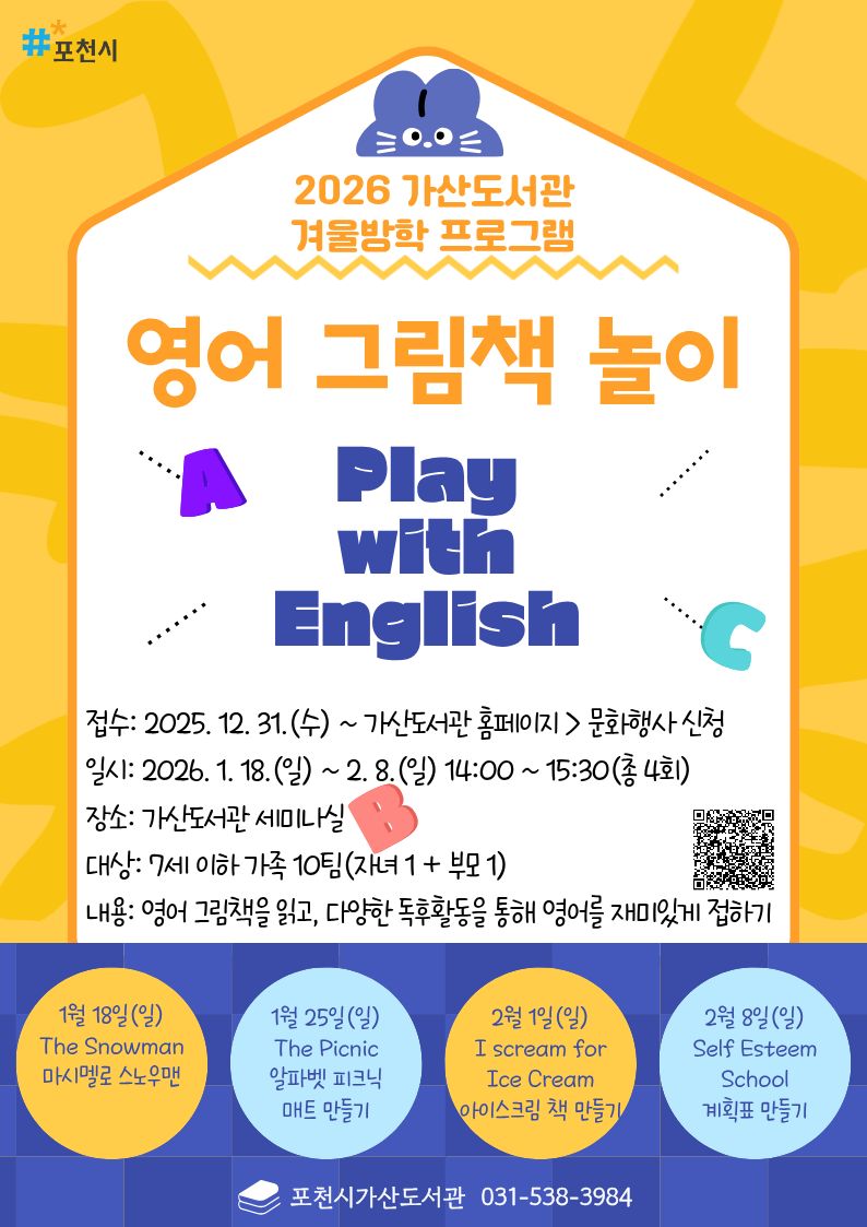 | 자녀1 + 부모1 신청해주세요. 총 4회 수업입니다. ![]() 2026년 가산도서관 겨울방학 프로그램 《영어 그림책 놀이》 - 일시: 2026. 1. 18.(일) ~ 2. 8.(일) 14:00 ~ 15:30(총 4회) - 장소: 가산도서관 세미나실 - 대상: 7세 이하 가족 10팀(자녀 1 + 부모 1) - 내용: 영어 그림책을 읽고, 다양한 독후활동을 통해 영어를 재미있게 접하기 · 1회: 「The Snowman」/ 마시멜로 스노우맨 · 2회: 「The Picnic」/ 알파벳 피크닉 매트 만들기 · 3회: 「I scream for Ice Cream」/ 아이스크림 책 만들기 · 4회: 「Self Esteem School」/ 자존감 올려주는 계획표 만들기 - 문의: 031-538-3984 ★ 1. 4.(일)까지 5일간 포천시민 우선 신청(이후 포천시민 외 접수 가능) ★ 접수 시 비고란에 거주 지역(읍/면/동까지) 작성 필수 |