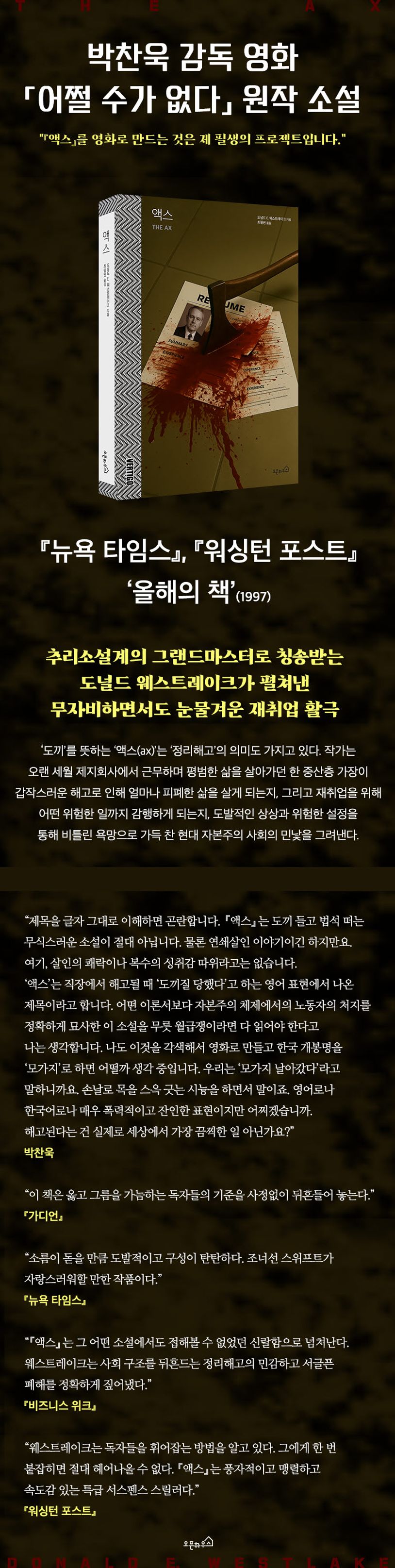 에드거 상 3회 수상에 빛나는 추리소설의 대가 도널드 E. 웨스트레이크의 『액스』는 1997년 미국에서 출간되자마자 베스트셀러에 올랐으며,
