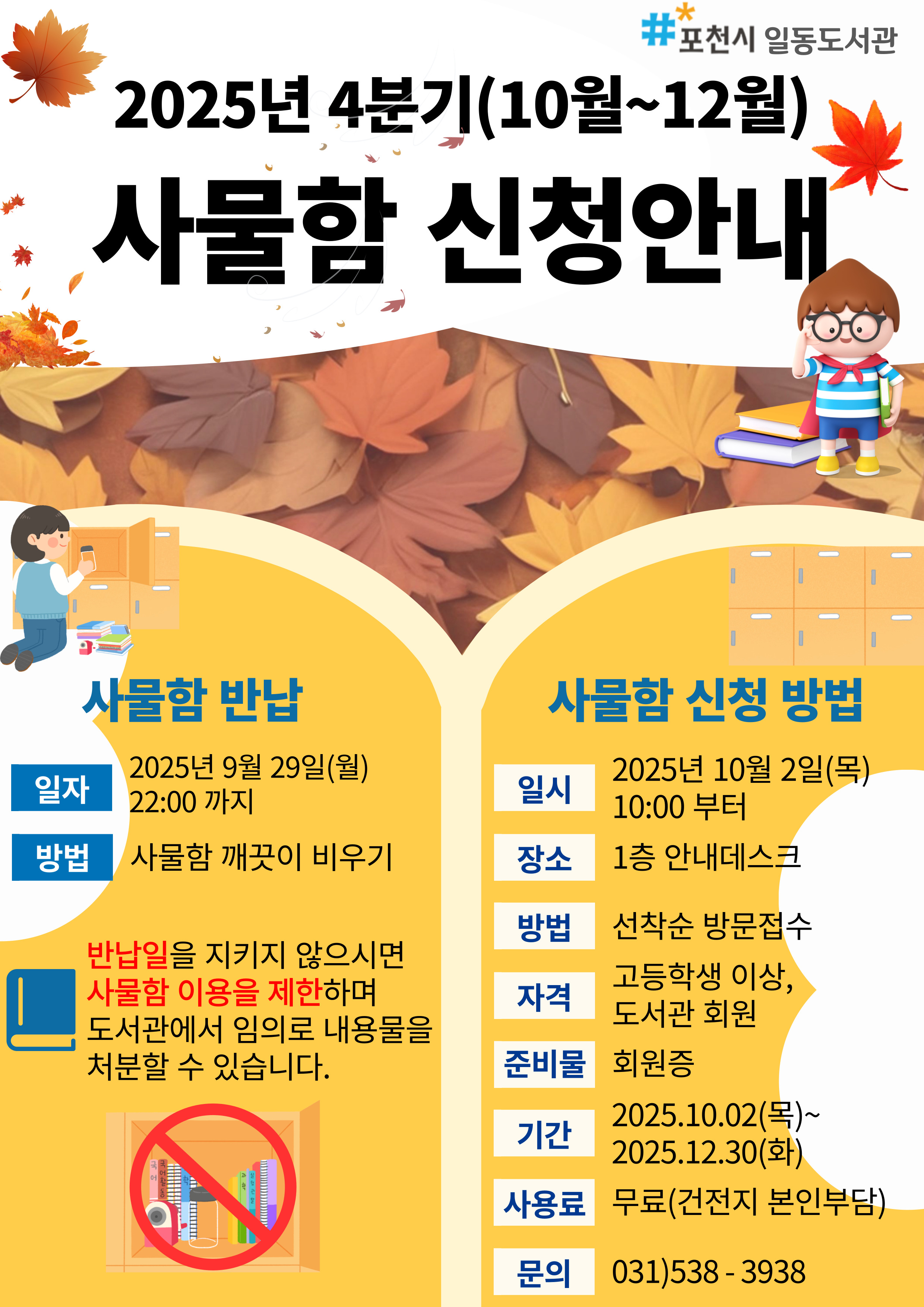 사물함 신청안내 ■ 사물함 신청 방법 - 신청일시 : 2025. 10월 2일(목) 10:00 ~ - 신청장소 : 1층 안내데스크