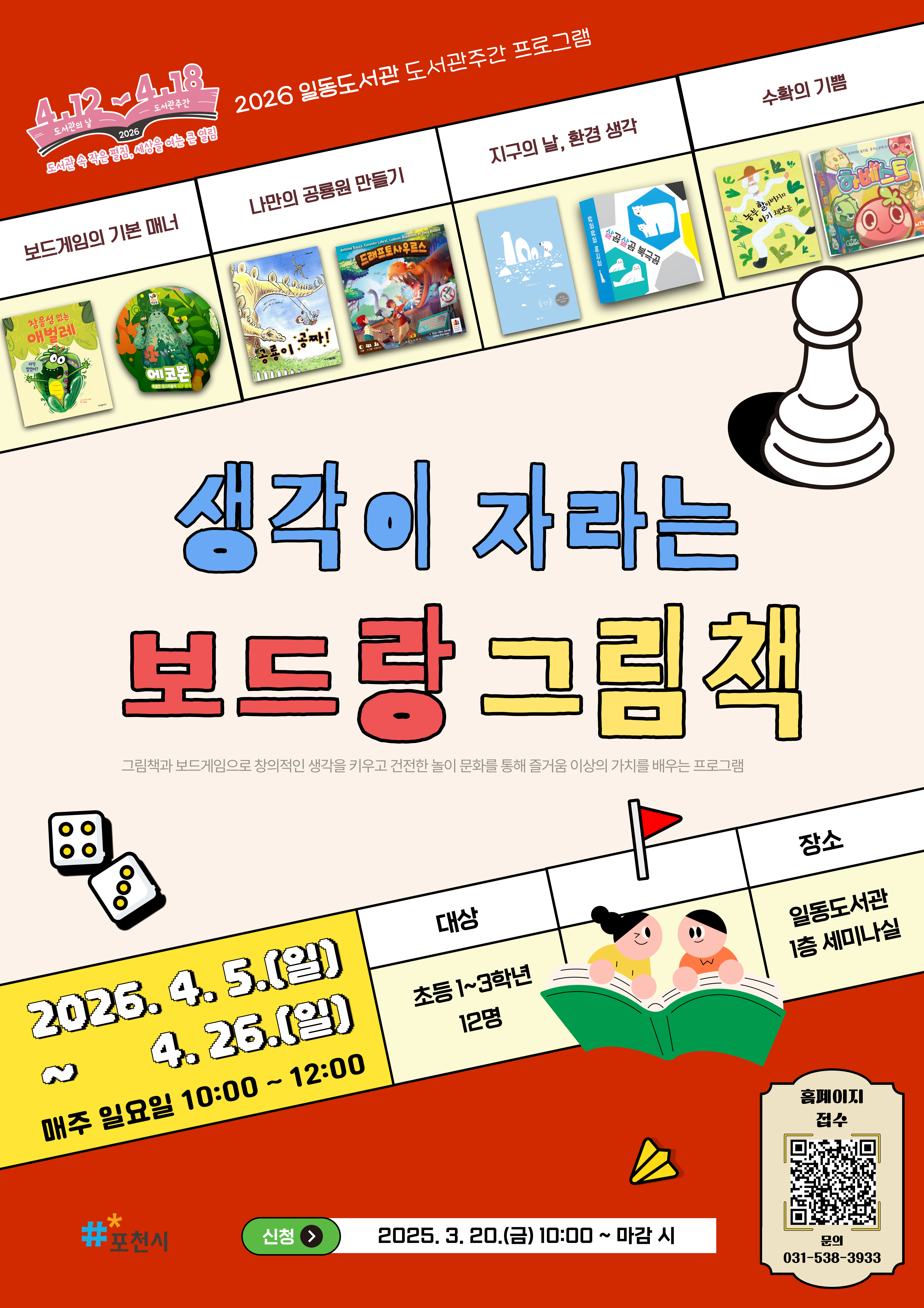 ![]() 일동도서관 2026년 도서관주간 프로그램 생각이 자라는 보드랑 그림책 ○ 일시: 2026. 4. 5. ~ 4. 26. 매주 일요일 10시~12시 ○ 장소: 일동도서관 1층 세미나실 ○ 대상: 초등 1~3학년 12명 ○ 강사: 황미영 ○ 접수일시: 2026. 3. 20.(수) ~ 마감 시까지 ○ 접수방법: 일동도서관 홈페이지 접수(선착순) *문의: 일동도서관(031-538-3933) ★ 3. 24.(화)까지 5일간 포천시민 우선 신청(이후 포천시민 외 접수 가능) ★ 접수 시 비고란에 거주 지역(읍/면/동까지) 작성 필수 |