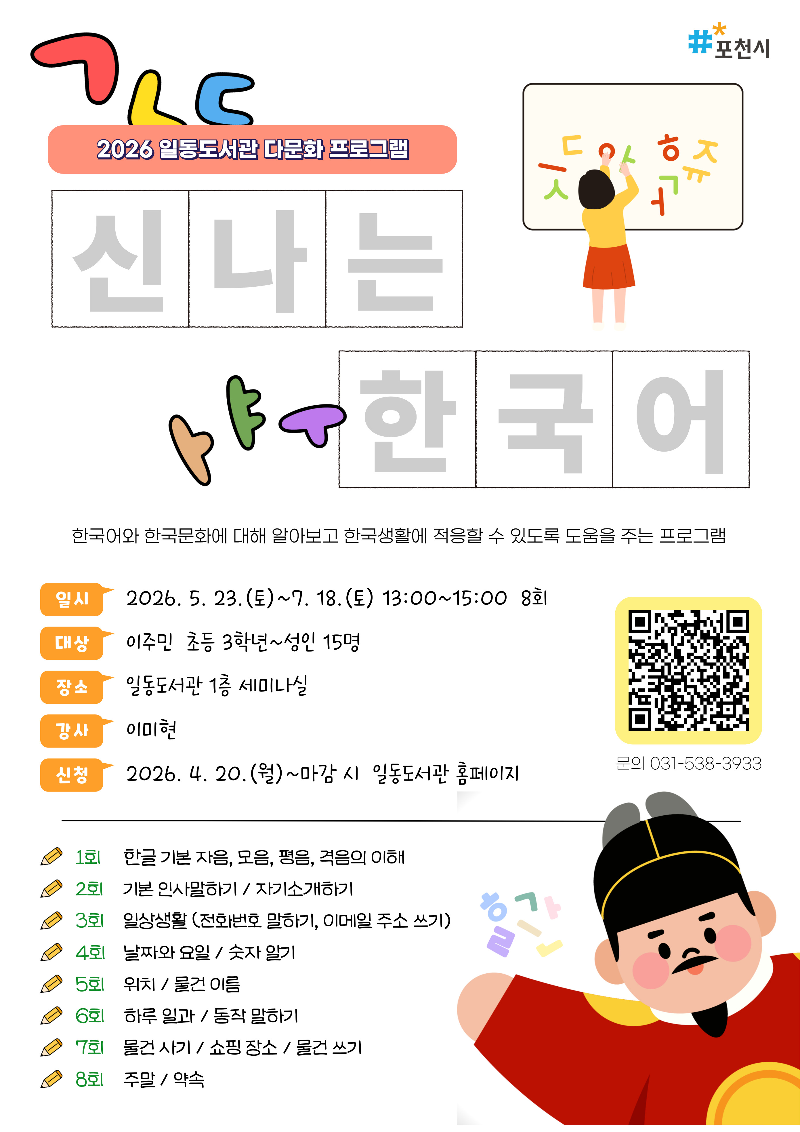 ![]() 일동도서관 2026년 다문화 프로그램 <신나는 한국어> ○ 일시: 2026. 5. 23. ~ 7. 18. 매주 일요일 13시~15시 ○ 장소: 일동도서관 1층 세미나실 ○ 대상: 이주민 초등 3학년~성인 15명 ○ 강사: 이미현 ○ 접수일시: 2026. 4. 20.(월) ~ 마감 시까지 ○ 접수방법: 일동도서관 홈페이지 접수(선착순) *문의: 031-538-3933 ★ 4. 24.(금)까지 5일간 포천시민/다문화 가정 우선 신청(이후 포천시민 외 접수 가능) ★ 접수 시 비고란에 거주 지역(읍/면/동까지) 작성 필수 |