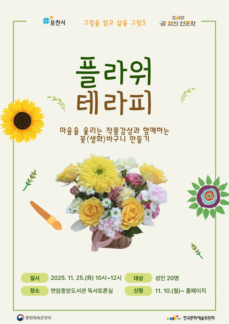 * 면암중앙도서관 길 위의 인문학 '그림을 읽고 삶을 그림(3)' * 신청 안내 ★ 플라워 테라피 - 작품감상과 함께하는 꽃(생화) 바구니 만들기 ★ 1. 접수기간/방법: 2025. 11. 7.(금) ~ / 도서관홈페이지 문화행사 신청 접수 2. 운영일시: 2025. 11. 25.(화) 10시~12시 3. 대상: 성인 20명 4. 장소: 면암중앙도서관 독서토론실 5. 강사: 권아름 (행복원예교육연구소) ♥ 공모 사업 선정으로 무료로 진행되는 사업입니다. 많은 신청 바랍니다. 신청바로가기