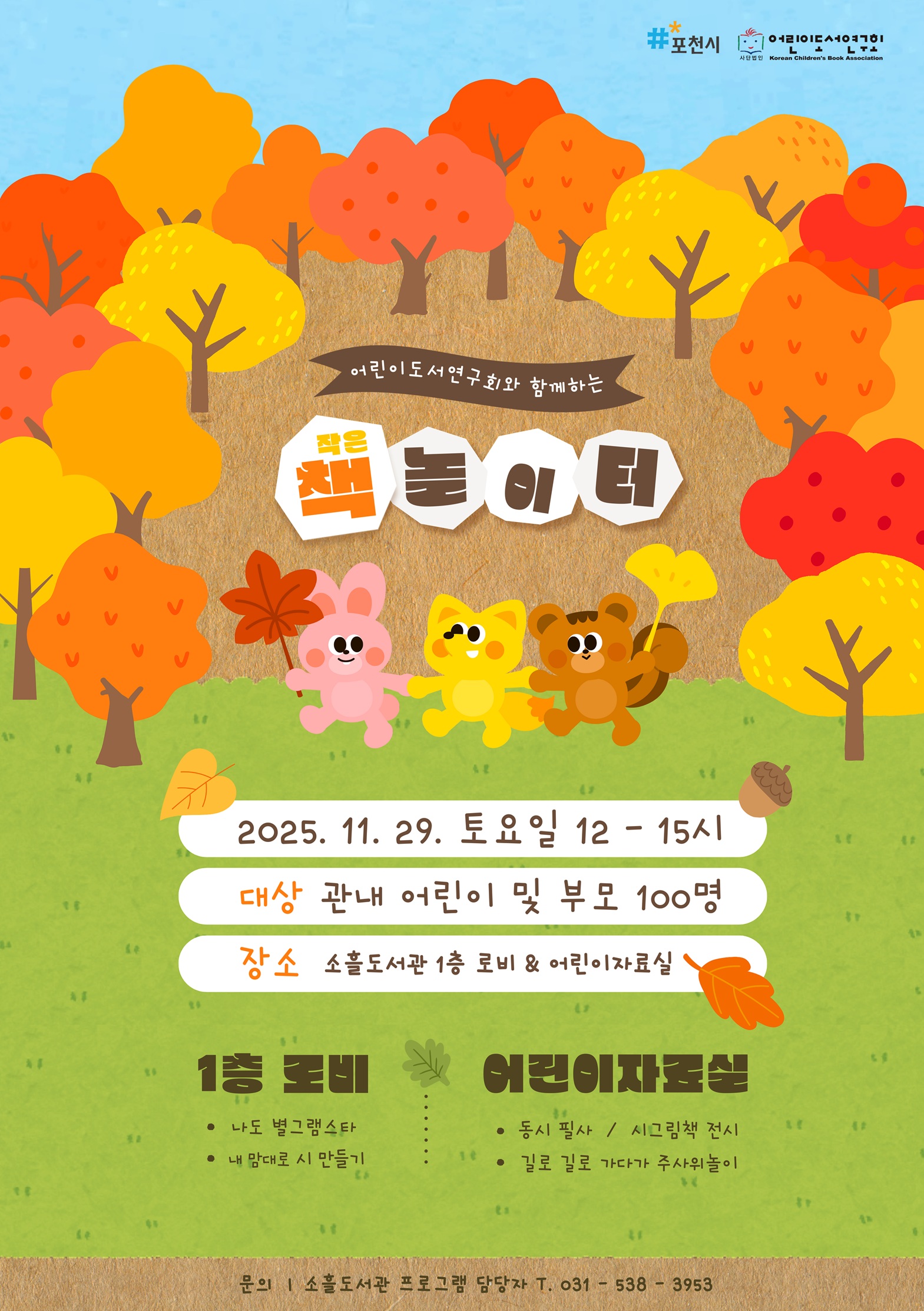 「어린이도서연구회와 함께하는 작은 책 놀이터」○일시: 2025. 11. 29.(토) 12:00~15:00 ○대상: 관내 어린이 및 부모 100명 ○장소: 소흘도서관 1층로비 및 어린이실 ○내용: 나도 별그램스타, 내맘대로 시 만들기, 동시필사/시그림책 전시, 길로 길로 가다가 주사위놀이 (모든 체험에 참여한 어린이에게 간식 꾸러미 증정) ※별도의 사전 신청은 받지 않으며 모두 현장 참여로 진행됩니다. ○문의: 031-538-3953 |