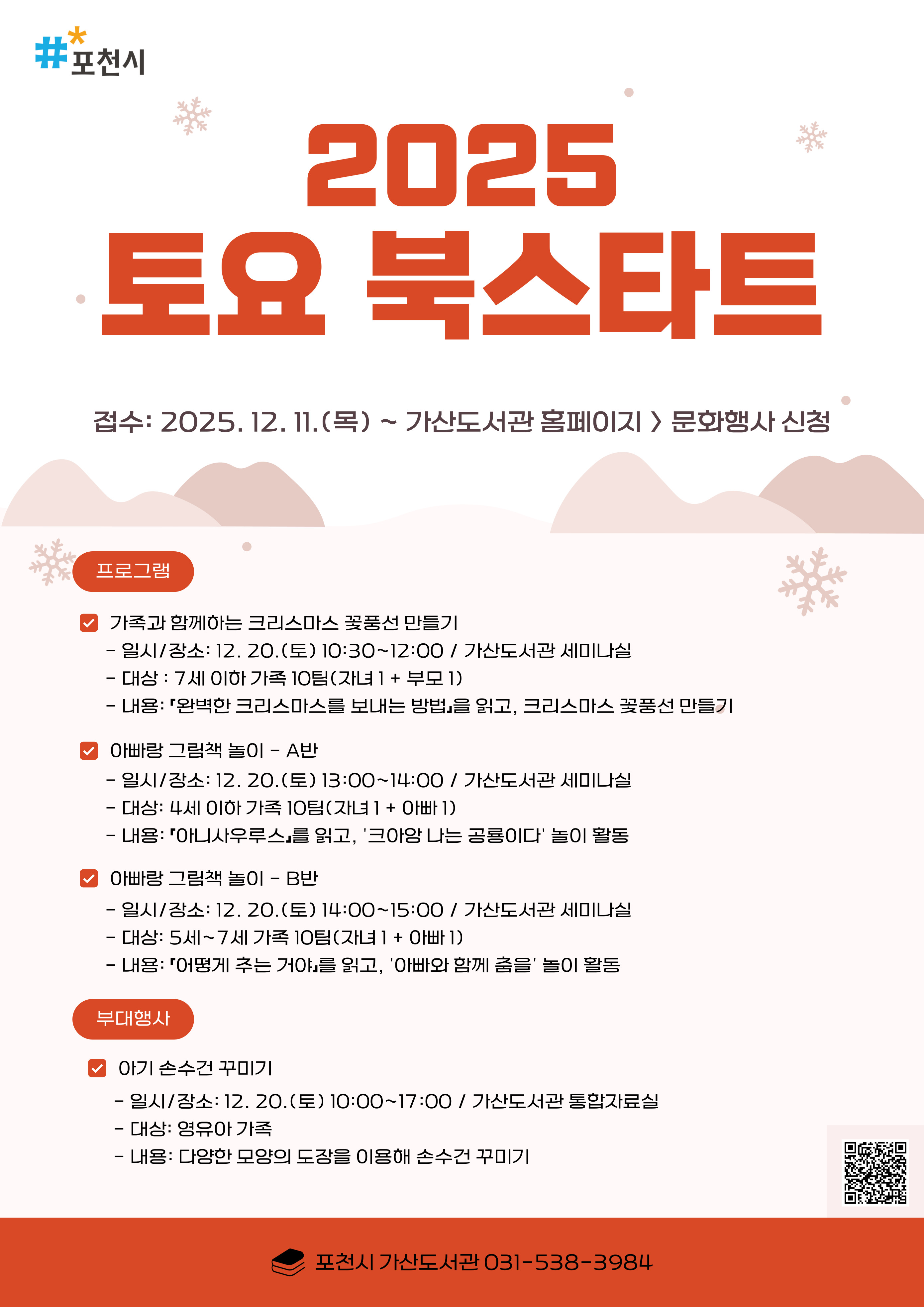 ![]() (#*포천시) 2025 토요 북스타트 ✔️접수: 2025. 12. 11.(목) ~ 가산도서관 홈페이지 > 문화행사 신청 <프로그램> ✔️가족과 함께하는 크리스마스 꽃풍선 만들기 - 일시/장소: 12. 20.(토) 10:30~12:00 / 가산도서관 세미나실 - 대상: 7세 이하 가족 10팀(자녀 1 + 부모 1) - 내용: 「완벽한 크리스마스를 보내는 방법」을 읽고, 크리스마스 꽃풍선 만들기 ✔️ 아빠랑 그림책 놀이 - A반 - 일시/장소: 2025. 12. 20.(토) 13:00 ~ 14:00 / 가산도서관 세미나실 - 대상: 4세 이하 가족 10팀(자녀1 + 아빠1) - 내용: 「아니사우루스」를 읽고, '크아앙 나는 공룡이다' 놀이 활동 ✔️ 아빠랑 그림책 놀이 - B반 - 일시/장소: 2025. 12. 20.(토) 14:00 ~ 15:00 / 가산도서관 세미나실 - 대상: 5세~7세 가족 10팀(자녀1 + 아빠1) - 내용: 「어떻게 추는 거야」를 읽고, '아빠와 함께 춤을' 놀이 활동 <부대행사> ✔️ 아기 손수건 꾸미기 - 일시/장소: 2025. 12. 20.(토) 10:00 ~ 17:00 / 가산도서관 통합자료실(당일 참여) - 대상: 영유아 가족 - 내용: 다양한 모양의 도장을 이용해 손수건 꾸미기 포천시 가산도서관 031-538-3984 |