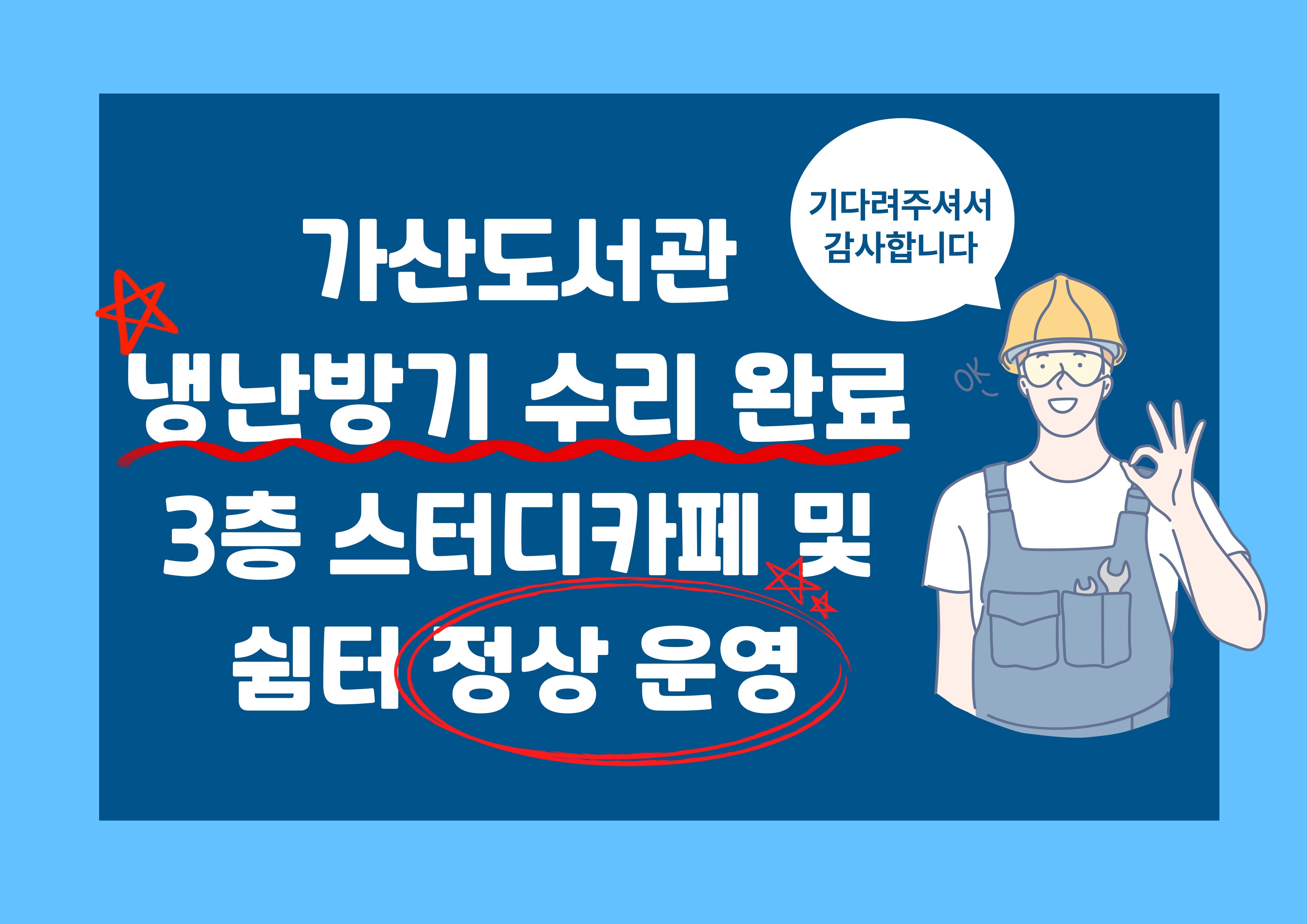 가산도서관 냉난방기 수리완료(3층 스터디카페 및 쉼터 이용 가능)