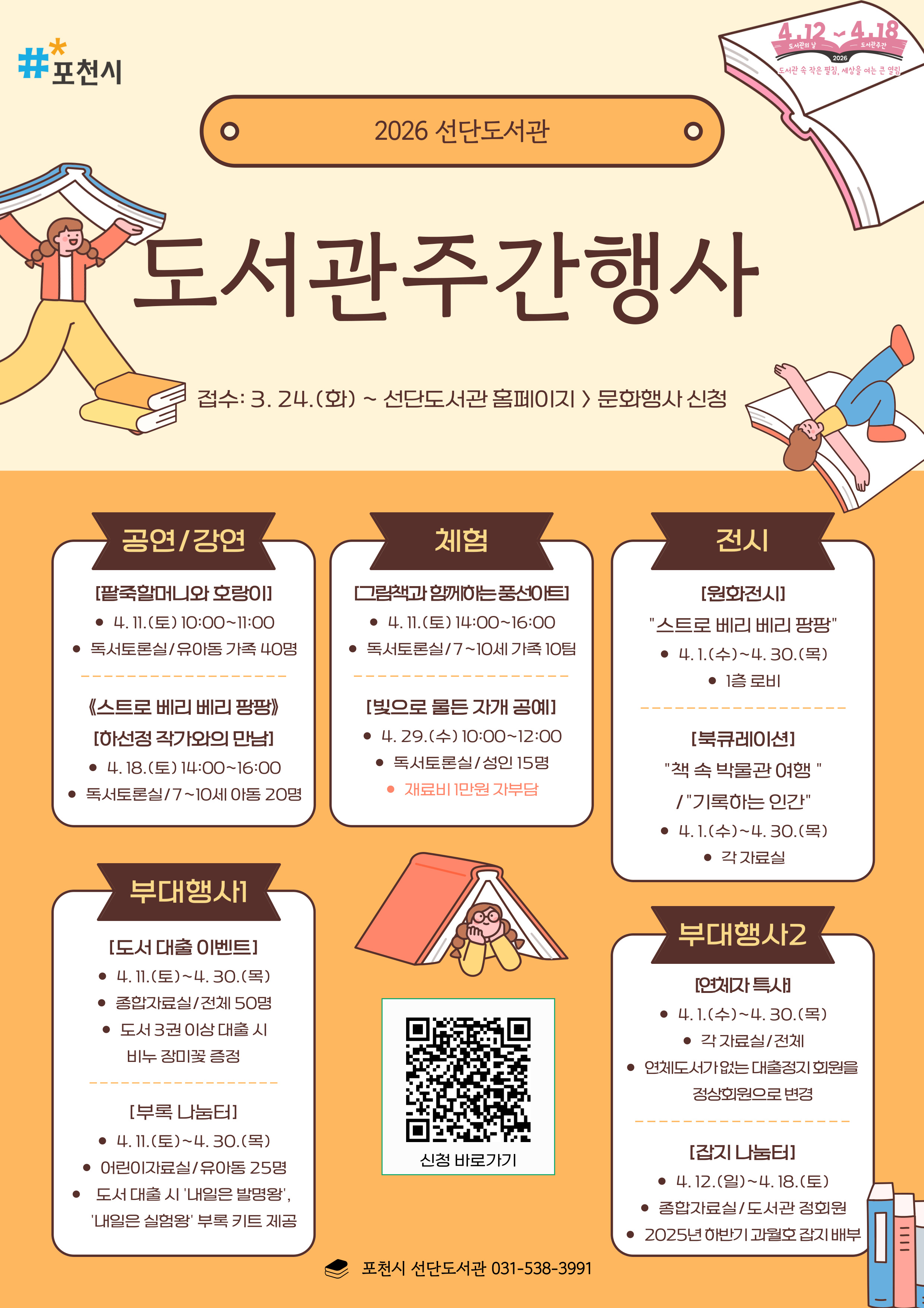 신청 바로가기 ▶ ▶ ▶![]() 《2026 선단도서관 도서관주간 행사 안내》 접수: 2026. 3. 24.(화) ~ 선단도서관 홈페이지 > 문화행사 신청 ★ 팥죽할머니와 호랑이 도서관 도깨비 도도가 들려주는 '팥죽할머니와 호랑이' 이야기 공연 - 4. 11.(토) 10:00 ~ 11:00 - 유아동 가족 40명 - 선단도서관 독서토론실 ★ 그림책과 함께하는 풍선아트 「복실이 꽃신」을 함께 읽고, 반려동물 이야기 나누기, 가족과 함께 풍선 댕댕이 만들기 - 4. 11.(토) 14:00~16:00 - 7~10세 가족 10팀(2인 1조) - 선단도서관 독서토론실 ★ '스트로 베리 베리 팡팡' 하선정 작가와의 만남 작가님과 함께 '스트로 베리 베리 팡팡' 그림책을 즐기고, 마법 주문이 담긴 나만의 컵케이크 메모꽂이 만들기 - 4. 18.(토) 14:00~16:00 - 7~10세 아동 20명 - 선단도서관 독서토론실 ★ 빛으로 물든 자개 공예 빛과 보는 각도에 따라 은은한 색상을 나타내는 자개를 활용한 나만의 자개 손거울 키링 만들기 - 4. 29.(수) 10:00 ~ 12:00 - 성인 15명 - 선단도서관 독서토론실 - 재료비 1만원 자부담 ★ 도서 대출 이벤트 '세계 책의 날'을 맞아 도서를 3권 이상 대출한 이용자에게 비누 장미꽃 증정 - 4. 11.(토) ~ 4. 30.(목) - 전체 50명 - 종합자료실 ★ 부록 나눔터 도서를 1권 이상 대출한 이용자에게 '내일은 발명왕'. '내일은 실험왕' 부록 키트 제공 - 4. 11.(토) ~ 4. 30.(목) - 유아동 25명 - 어린이자료실 ★ 연체자 특사 연체도서가 없는 대출정지회원을 정상회원으로 변경 - 4. 1.(수) ~ 4. 30.(목) - 각 자료실 ★ 잡지 나눔터 2025년 하반기 과월호 잡지 배부 - 4. 12.(일) ~ 4. 18.(토) - 도서관 정회원 - 종합자료실 ★ 원화전시 <스트로 베리 베리 팡팡> 도치의 생일날, 사라진 딸기케이크의 범인을 찾는 흥미진진한 이야기를 다룬 "스트로 베리 베리 팡팡" 원화전시 - 4. 1.(수) ~ 4. 30.(목) - 선단도서관 1층 로비 ★ 북큐레이션 - 4. 1.(수) ~ 4. 30.(목) - 어린이자료실: 책 속 박물관 여행 - 종합자료실: 기록하는 인간 - 매일의 기록이 쌓여 내가 된다 문의: 포천시 선단도서관 031-538-3991 |