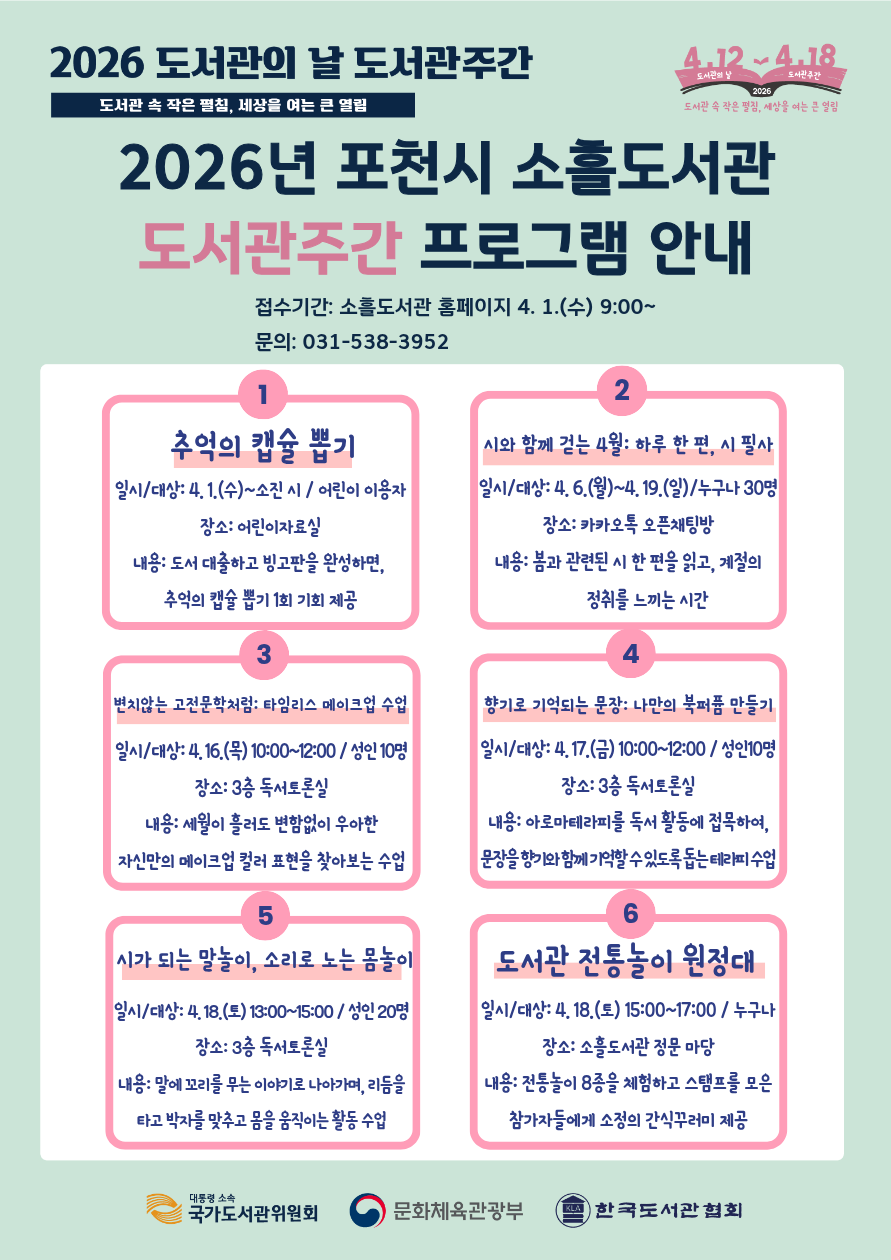 ![]() 2026년 도서관의 날 도서관주간 도서관 속 작은 펼침, 세상을 여는 큰 열림 4. 12.~4. 18. 2026년 포천시 소흘도서관 도서관주간 프로그램 안내 접수기간: 소흘도서관 홈페이지 4. 1.(수) 9:00~ 문의: 031-538-3952 1. 추억의 캡슐 뽑기 일시/대상: 4. 1.(수)~소진 시 / 어린이 이용자 장소: 어린이 자료실 내용: 도서 대출하고 빙고판을 완성하면, 추억의 캡슐 뽑기 1회 기회 제공 2. 시와 함께 걷는 4월: 하루 한 편, 시 필사 일시/대상: 4. 6.(월)~4. 19.(일)/누구나 30명 장소: 카카오톡 오픈채팅방 내용: 봄과 관련된 시 한 편을 읽고, 계절의 정취를 느끼는 시간 3. 변치않는 고전문학처럼: 타임리스 메이크업 수업 일시/대상: 4. 16(목) 10:00~12:00 / 성인 10명 장소: 3층 독서토론실 내용: 세월이 흘러도 변함없이 우아한 자신만의 메이크업 컬러 표현을 찾아보는 수업 4. 향기로 기억되는 문장: 나만의 북퍼퓸 만들기 일시/대상: 4. 17.(금) 10:00~12:00 / 성인 10명 장소: 3층 독서토론실 내용: 아로마테라피를 독서 활동에 접목하여, 문장을 향기와 함께 기억할 수 있도록 돕는 테라피 수업 5. 시가 되는 말놀이, 소리로 노는 몸놀이 일시/대상: 4. 18.(토) 13:00~15:00 / 성인 20명 장소: 3층 독서토론실 내용: 말에 꼬리를 무는 이야기로 나아가며, 리듬을 타고 박자를 맞추고 몸을 움직이는 활동 수업 6. 도서관 전통놀이 원정대 일시/대상: 4. 18.(토) 15:00~17:00 / 누구나 장소: 소흘도서관 정문 마당 내용: 전통놀이 8종을 체험하고 스탬프를 모은 참가자들에게 소정의 간식 꾸러미 제공 |