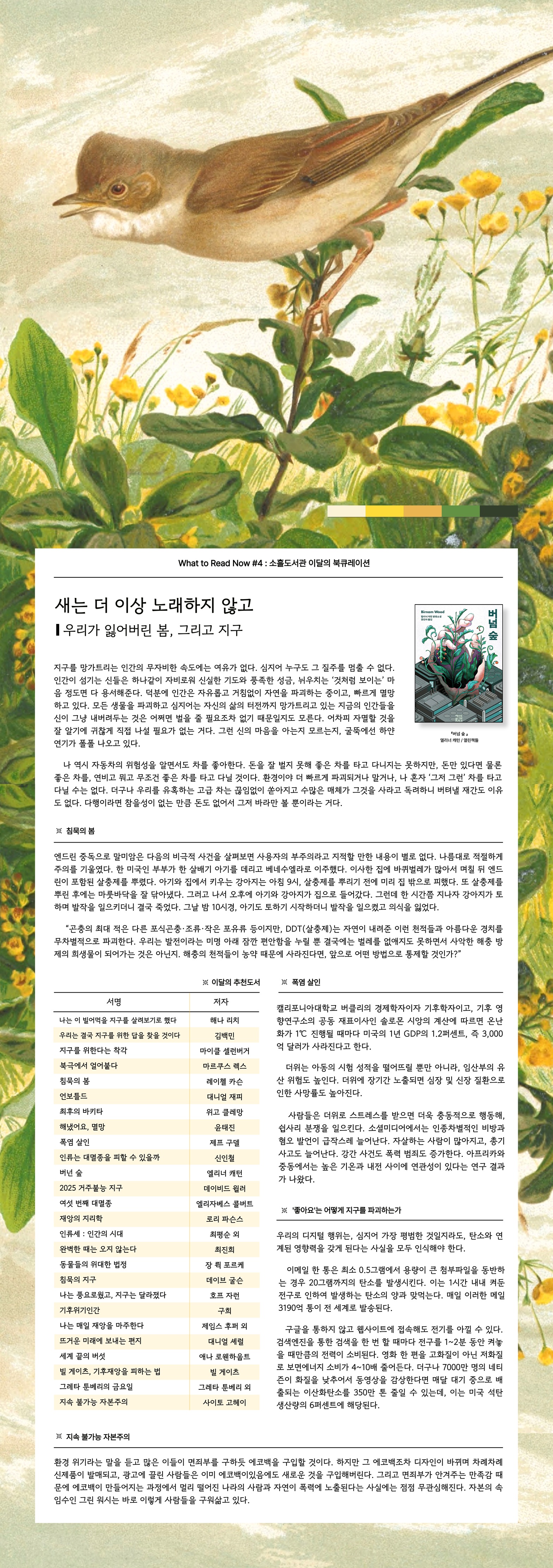 ![]() What to Read Now #4 : 소흘도서관 이달의 북큐레이션 새는 더 이상 노래하지 않고 : 우리가 잃어버린 봄, 그리고 지구 지구를 망가트리는 인간의 무자비한 속도에는 여유가 없다. 심지어 누구도 그 질주를 멈출 수 없다. 인간이 섬기는 신들은 하나같이 자비로워 신실한 기도와 풍족한 성금, 뉘우치는 ‘것처럼 보이는’ 마음 정도면 다 용서해준다. 덕분에 인간은 자유롭고 거침없이 자연을 파괴하는 중이고, 빠르게 멸망하고 있다. 나 역시 자동차의 위험성을 알면서도 차를 좋아한다. 돈을 잘 벌지 못해 좋은 차를 타고 다니지는 못하지만, 돈만 있다면 물론 좋은 차를, 연비고 뭐고 무조건 좋은 차를 타고 다닐 것이다. 환경이야 더 빠르게 파괴되거나 말거나, 나 혼자 ‘그저 그런’ 차를 타고 다닐 수는 없다. 더구나 우리를 유혹하는 고급 차는 끊임없이 쏟아지고 수많은 매체가 그것을 사라고 독려하니 버텨낼 재간도 이유도 없다. 다행이라면 참을성이 없는 만큼 돈도 없어서 그저 바라만 볼 뿐이라는 거다. ----------------------------------------------------- *침묵의 봄 1. 엔드린 중독으로 말미암은 다음의 비극적 사건을 살펴보면 사용자의 부주의라고 지적할 만한 내용이 별로 없다. 나름대로 적절하게 주의를 기울였다. 한 미국인 부부가 한 살배기 아기를 데리고 베네수엘라로 이주했다. 이사한 집에 바퀴벌레가 많아서 며칠 뒤 엔드린이 포함된 살충제를 뿌렸다. 아기와 집에서 키우는 강아지는 아침 9시, 살충제를 뿌리기 전에 미리 집 밖으로 피했다. 또 살충제를 뿌린 후에는 마룻바닥을 잘 닦아냈다. 그러고 나서 오후에 아기와 강아지가 집으로 들어갔다. 그런데 한 시간쯤 지나자 강아지가 토하며 발작을 일으키더니 결국 죽었다. 그날 밤 10시경, 아기도 토하기 시작하더니 발작을 일으켰고 의식을 잃었다. 평범하고 건강한 아기가 엔드린 때문에 식물인간이 되어, 보지도 듣지도 못하고 자주 근육 경련을 일으키며 주위와 관계를 끊어버렸다. 뉴욕의 한 병원에서 몇 달 동안 치료를 받았지만 병세는 나아지지 않았고 희망의 기미도 보이지 않았다. 아기를 담당한 의사는 이렇게 말했다. “제대로 회복할 수 있을지 의심스럽습니다.” 2. 곤충의 최대 적은 다른 포식곤충·조류·작은 포유류 등이지만, DDT는 자연이 내려준 이런 천적들과 아름다운 경치를 무차별적으로 파괴한다. 우리는 발전이라는 미명 아래 잠깐 편안함을 누릴 뿐 결국에는 벌레를 없애지도 못하면서 사악한 해충 방제의 희생물이 되어가는 것은 아닌지. 해충의 천적들이 농약 때문에 사라진다면, 앞으로 어떤 방법으로 통제할 것인가? ----------------------------------------------------- *폼염 살인 캘리포니아대학교 버클리의 경제학자이자 기후학자이고, 기후 영향연구소의 공동 재표이사인 솔로몬 시앙의 계산에 따르면, 온난화가 1℃ 진행될 때마다 미국의 1년 GDP의 1.2퍼센트, 즉 3,000억 달러가 사라진다고 한다. 더위는 아동의 시험 성적을 떨어뜨릴 뿐만 아니라, 임산부의 유산 위험도 높인다. 더위에 장기간 노출되면 심장 및 신장 질환으로 인한 사망률도 높아진다. 사람들은 더위로 스트레스를 받으면 더욱 충동적으로 행동해, 쉽사리 분쟁을 일으킨다. 소셜미디어에서는 인종차별적인 비방과 혐오 발언이 급작스레 늘어난다. 자살하는 사람이 많아지고, 총기 사고도 늘어난다. 강간 사건도 폭력 범죄도 증가한다. 아프리카와 중동에서는 높은 기온과 내전 사이에 연관성이 있다는 연구 결과가 나왔다. ----------------------------------------------------- *내 안의 차별주의자 우리의 디지털 행위는, 심지어 가장 평범한 것일지라도, 탄소와 연계된 영향력을 갖게 된다는 사실을 모두 인식해야 한다. 이메일 한 통은 최소 0.5그램에서 용량이 큰 첨부파일을 동반하는 경우 20그램까지의 탄소를 발생시킨다. 이는 1시간 내내 켜둔 전구로 인하여 발생하는 탄소의 양과 맞먹는다. 매일 이러한 메일 3190억 통이 전 세계로 발송된다. 구글을 통하지 않고 웹사이트에 접속해도 전기를 아낄 수 있다. 검색엔진을 통한 검색을 한 번 할 때마다 전구를 1~2분 동안 켜놓을 때만큼의 전력이 소비된다. 영화 한 편을 고화질이 아닌 저화질로 보면 에너지 소비가 4~10배 줄어든다. 더구나 7000만 명의 네티즌이 화질을 낮추어서 동영상을 감상한다면 매달 대기 중으로 배출되는 이산화탄소를 350만 톤 줄일 수 있는데, 이는 미국 석탄 생산량의 6퍼센트에 해당된다. ----------------------------------------------------- *지속 불가능 자본주의 환경 위기라는 말을 듣고 많은 이들이 면죄부를 구하듯 에코백을 구입할 것이다. 하지만 그 에코백조차 디자인이 바뀌며 차례차례 신제품이 발매되고, 광고에 끌린 사람들은 이미 에코백이 있음에도 새로운 것을 구입해버린다. 그리고 면죄부가 안겨주는 만족감 때문에 에코백이 만들어지는 과정에서 멀리 떨어진 나라의 사람과 자연이 폭력에 노출된다는 사실에는 점점 무관심해진다. 자본의 속임수인 그린 워시는 바로 이렇게 사람들을 구워삶고 있다. ----------------------------------------------------- 이 달의 추천 도서 *나는 이 빌어먹을 지구를 살려보기로 했다 / 해나 리