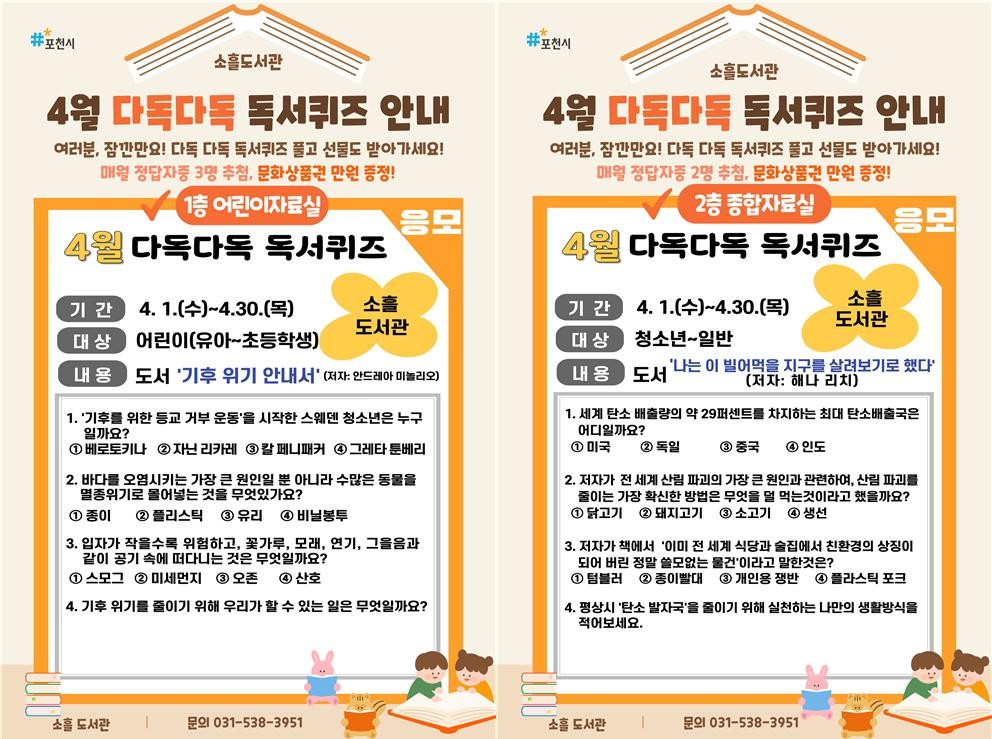 | 제목 | 2026년 4월 소흘도서관 '다독다독 독서퀴즈' 안내 |