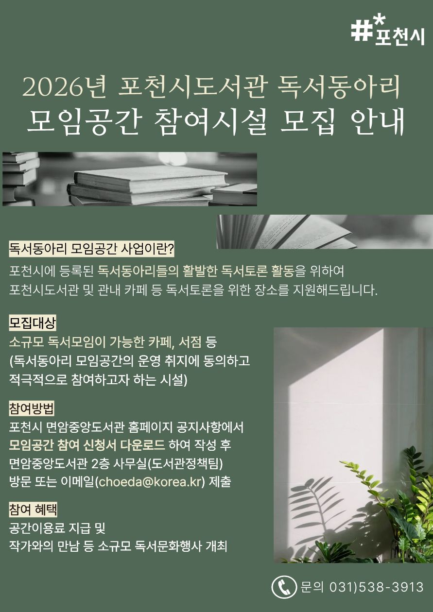 | 제목 | 2026년 포천시 독서동아리 모임공간 참여시설 모집 안내(상시 신청 가능) |