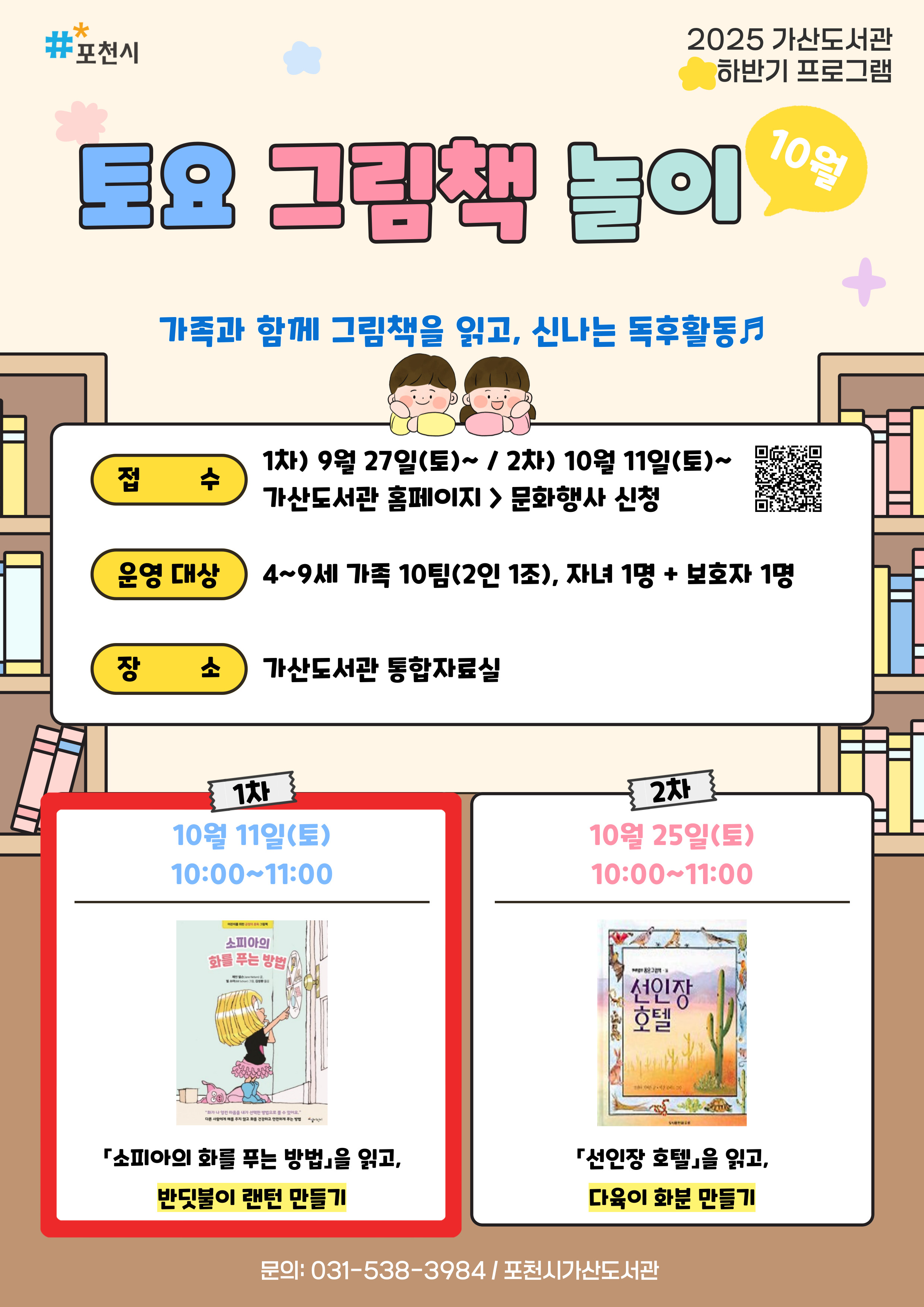 ![]() (포천시 / 2025 가산도서관 하반기 프로그램) 《토요 그림책 놀이》 ▶ 일시: 10월 11일(토) 10:00~11:00 ▶ 장소: 가산도서관 통합자료실 ▶ 대상: 4~9세 10가족(포천시민 우선 접수) ▶ 내용: 「소피아의 화를 푸는 방법」을 읽고, 반딧불이 랜턴 만들기 ▶ 문의: 031-538-3984 (포천시 가산도서관) ★ 10. 1.(수)까지 5일간 포천시민 우선 신청(이후 포천시민 외 접수 가능) ★ 접수 시 비고란에 거주 지역(읍/면/동까지) 작성 필수 |