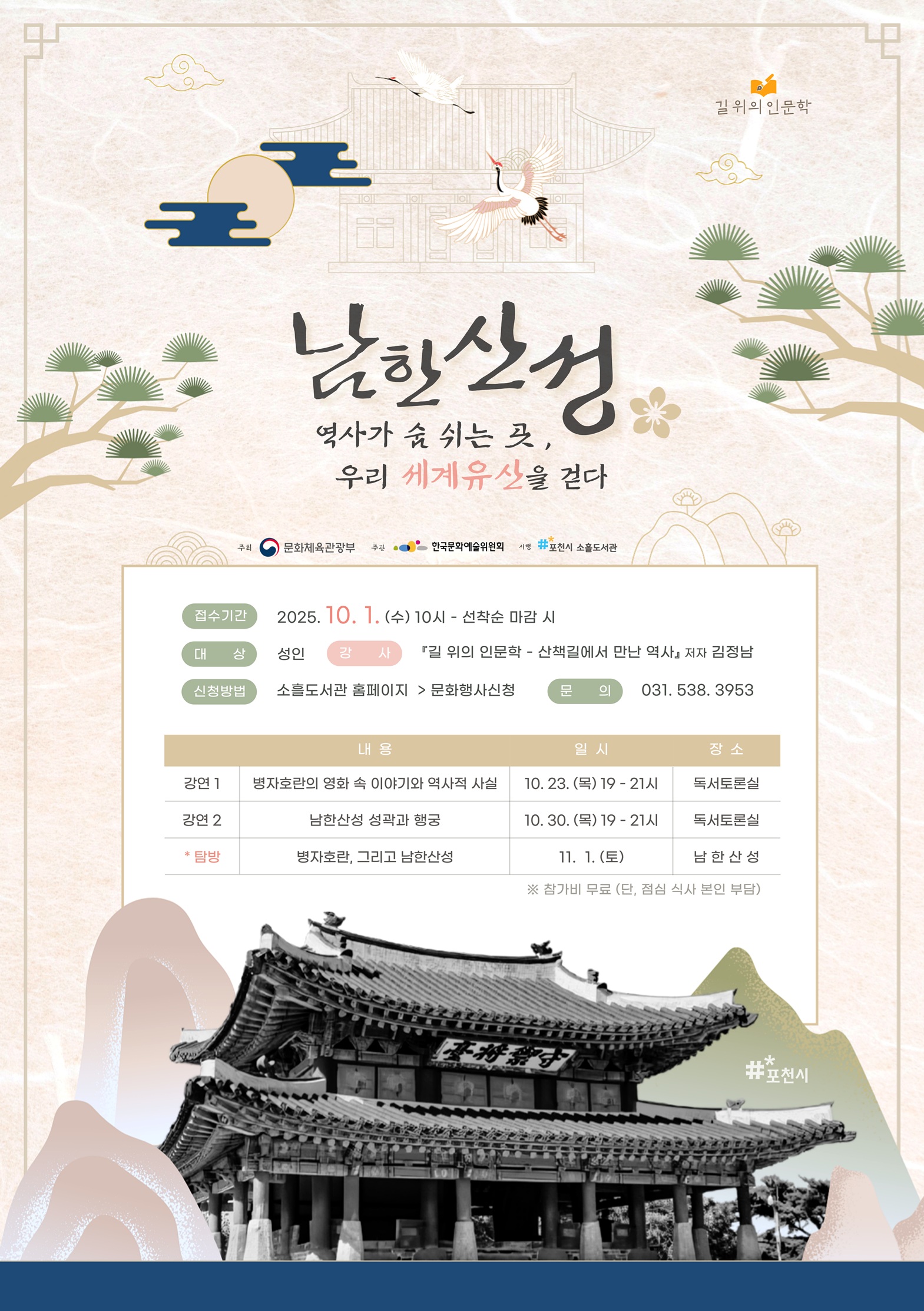 ![]() '역사가 숨쉬는 곳, 우리 세계 유산을 걷다' - 접수기간: 2025. 10. 1.(수) 10시 ~ 선착순 마감 시 - 대상: 성인 - 강사: 『길위의 인문학- 산책길에서 만난 역사』의 저자 김정남 - 신청: 소흘도서관 홈페이지 > 문화행사신청 - 문의: 031-538-3953 강연1 : 병자호란의 영화속 이야기와 역사적 사실 2025. 10. 23.(목) 19~21시 / 독서토론실 강연2 : 남한산성 성곽과 행궁 2025. 10. 30.(목) 19~21시 / 독서토론실 탐방: 남한산성 2025. 11. 1.(토) / 남한산성 탐방 ※ 참가비 무료. 단, 점심 식사 본인 부담 - 주최: 문화체육관광부 - 주관: 한국문화예술위원회 - 시행: 포천시 소흘도서관 |
