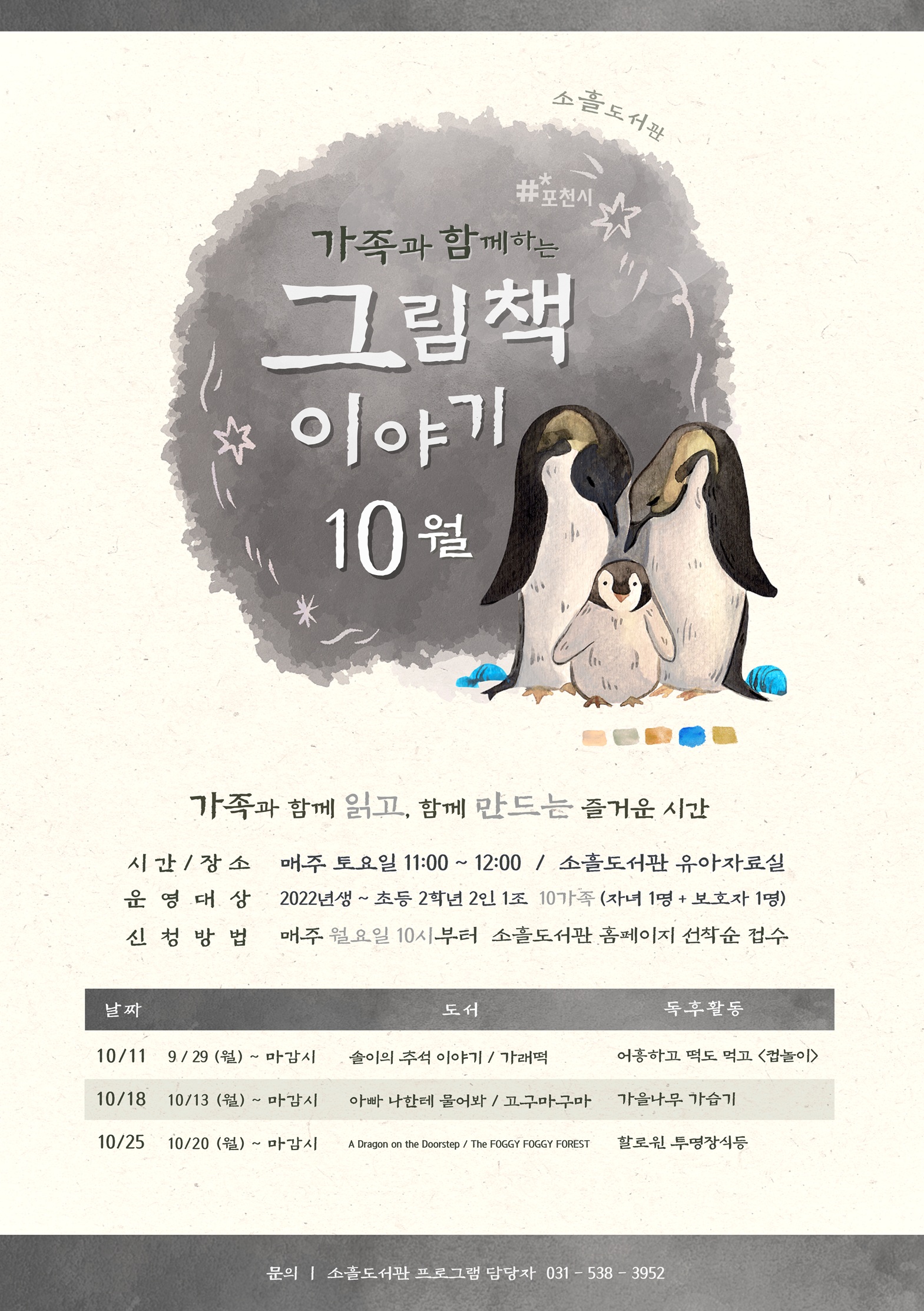 ![]() ○ 활동 도서 - 솔이의 추석이야기(이억배) - 가래떡(사이다) ○ 활동 주제 어흥하고 떡도 먹고 컵놀이 ○ 대상 가족 10팀 (2022년생~초등2학년 아동 1명+보호자 1명) ※ 만들기 재료는 도서관에서 제공해드립니다. ★신청 전, 반드시 읽어주세요★ - 3일 간 포천 시민 우선 신청(이후 포천시민 외 접수 가능) - 도서관내 주차장이 협소하니 대중교통이나 도보이용 부탁드립니다. - 신청 인원에 맞게 재료를 미리 준비해두는 프로그램이기 때문에 신청 후, 당일 취소 및 노쇼 시 추후 '가족과 함께하는 그림책 이야기' 프로그램 신청이 제한됩니다. |