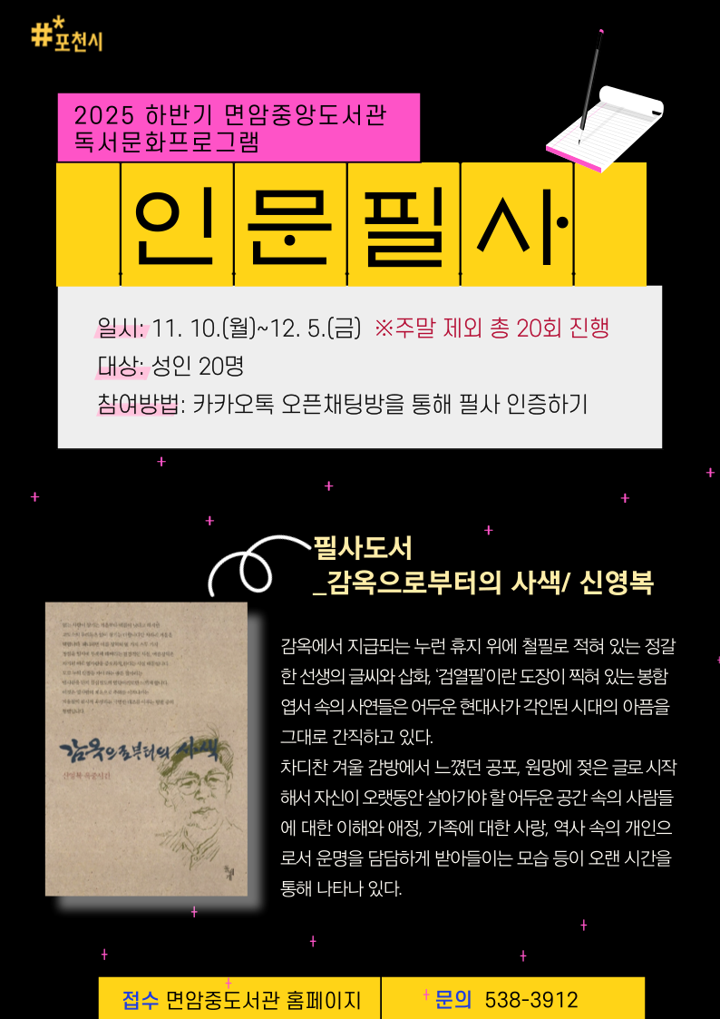 ![]() 2025 하반기 면암중앙도서관 독서문화프로그램 <인문필사> 일시: 11. 10.(월)~12. 5.(금) *주말 제외 총 20회 진행 대상: 성인 20명 참여방법: 카카오톡 오픈채팅방을 통해 필사 인증하기 필사도서: 감옥으로부터의 사색/ 신영복 _도서소개 감옥에서 지급되는 누런 휴지 위에 철필로 적혀 있는 정갈한 선생의 글씨와 삽화, ‘검열필’이란 도장이 찍혀 있는 봉함엽서 속의 사연들은 어두운 현대사가 각인된 시대의 아픔을 그대로 간직하고 있다. 차디찬 겨울 감방에서 느꼈던 공포, 원망에 젖은 글로 시작해서 자신이 오랫동안 살아가야 할 어두운 공간 속의 사람들에 대한 이해와 애정, 가족에 대한 사랑, 역사 속의 개인으로서 운명을 담담하게 받아들이는 모습 등이 오랜 시간을 통해 나타나 있다. 접수: 면암중앙도서관 홈페이지 문의: 538-3912 |