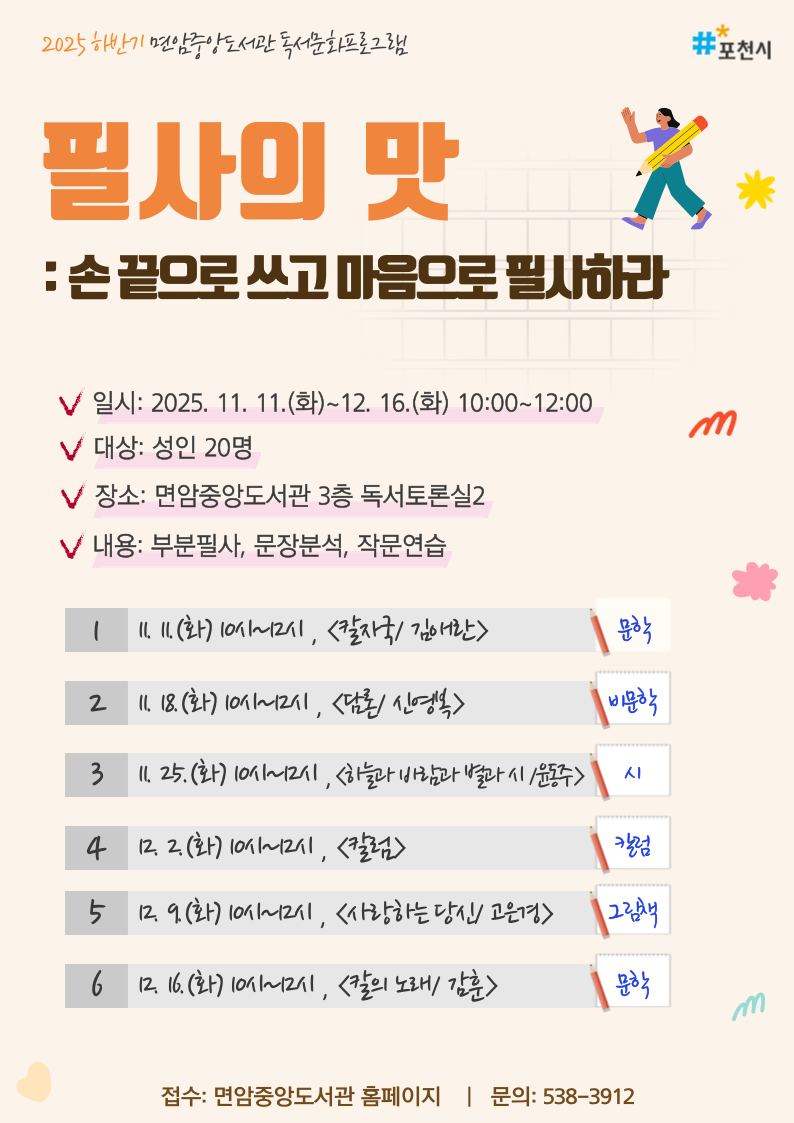 ![]() 2025 하반기 면암중앙도서관 독서문화프로그램 <필사의 맛: 손 끝으로 쓰고 마음으로 필사하라> 일시: 11. 11.(화)~12. 16.(화) 10:00~12:00 대상: 성인 20명 장소: 면암중앙도서관 3층 독서토론실2 내용: 부분필사, 문장분석, 작문연 1. 11/11(화) 10시~12시: <칼자국/ 김애란> #문학 2. 11/18(화) 10시~12시:<담론/신영복> #비문학 3. 11/25(화) 10시~12시:<하늘과 바람과 별과 시/윤동주> #시 4. 12/2(화) 10시~12시:<칼럼> 5. 12/9(화) 10시~12시:<사랑하는 당신/고은경> #그림책 6. 12/16(화) 10시~12시:<칼의 노래/김훈> #문학 접수: 면암중앙도서관 홈페이지 문의: 538-3912 |