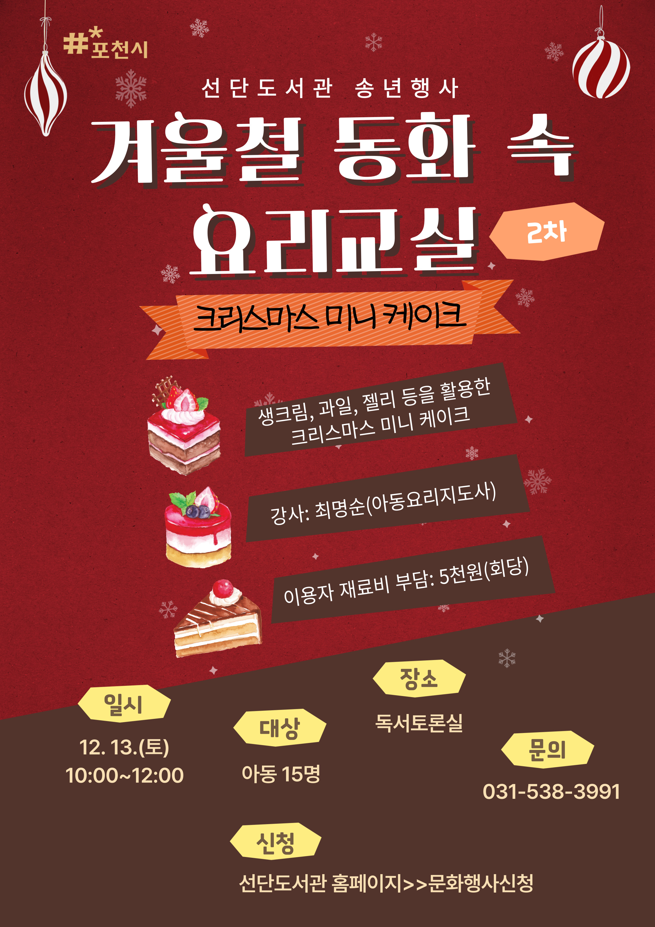 선단도서관에서 송년을 맞이하여 '겨울철 동화 속 요리교실' 프로그램을 운영할 예정이오니, 많은 관심 바랍니다. |