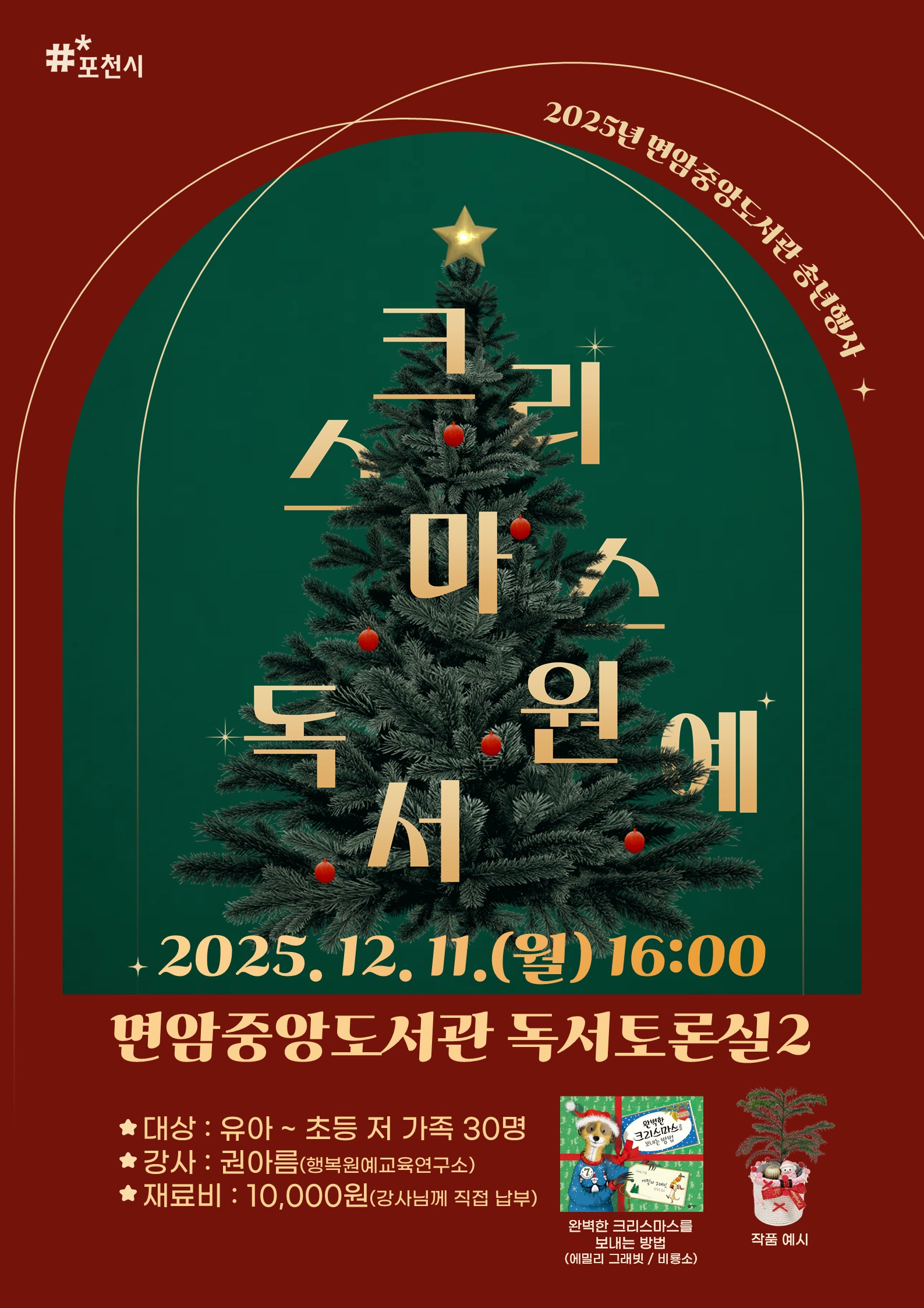 ![]() 2025년 포천시 면암중앙도서관 송년행사 크리스마스 독서 원예 -일시: 2025. 12. 11.(월) 16:00~18:00 -장소: 면암중앙도서관 독서토론실2 -대상: 유아~초등저 가족 30명(15가족) -재료비: 1만원 (강사님께 직접 납부) |