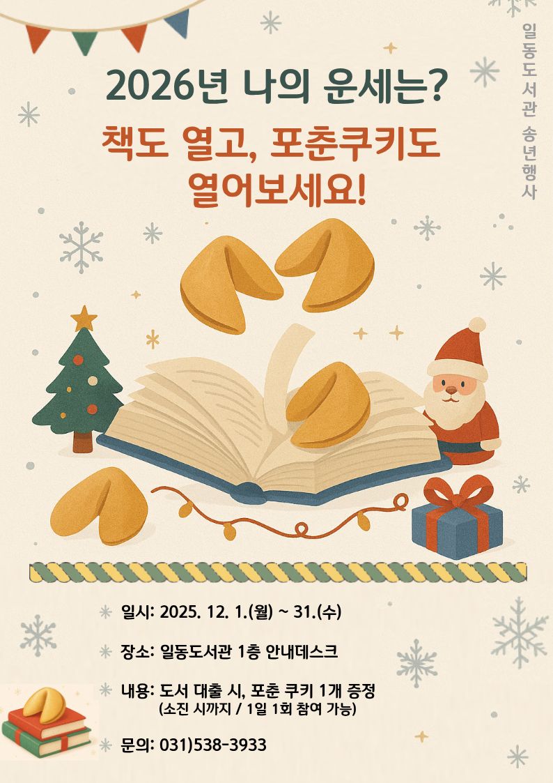![]() 연말 맞이 포춘쿠키 일시: 2025. 12. 1.(월) ~ 31.(수) 장소: 일동도서관 1층 안내데스크 내용: 도서 대출 시, 포춘 쿠키 1개 증정 (소진 시까지 / 1일 1회 참여 가능) 문의: 031)538-3933 |