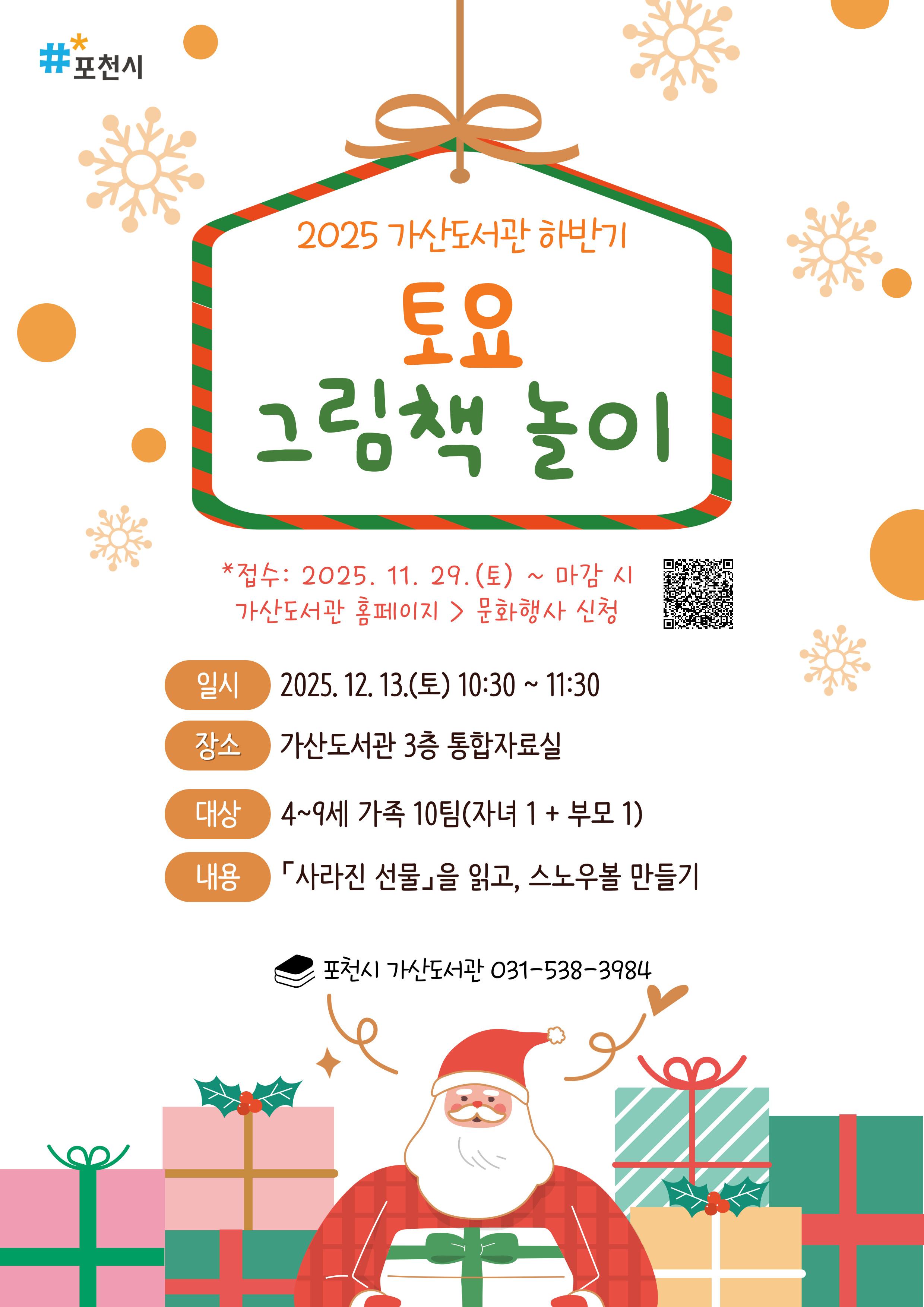 ![]() (포천시 / 2025 가산도서관 하반기 프로그램) 《토요 그림책 놀이》 ▶ 일시: 12월 13일(토) 10:30~11:30 ▶ 장소: 가산도서관 3층 통합자료실 ▶ 대상: 4~9세 10가족(자녀 1 + 부모 1) ▶ 내용: 「사라진 선물」을 읽고, 스노우볼 만들기 ▶ 문의: 031-538-3984 (포천시 가산도서관) ★ 12. 3.(수)까지 5일간 포천시민 우선 신청(이후 포천시민 외 접수 가능) ★ 접수 시 비고란에 거주 지역(읍/면/동까지) 작성 필수 |