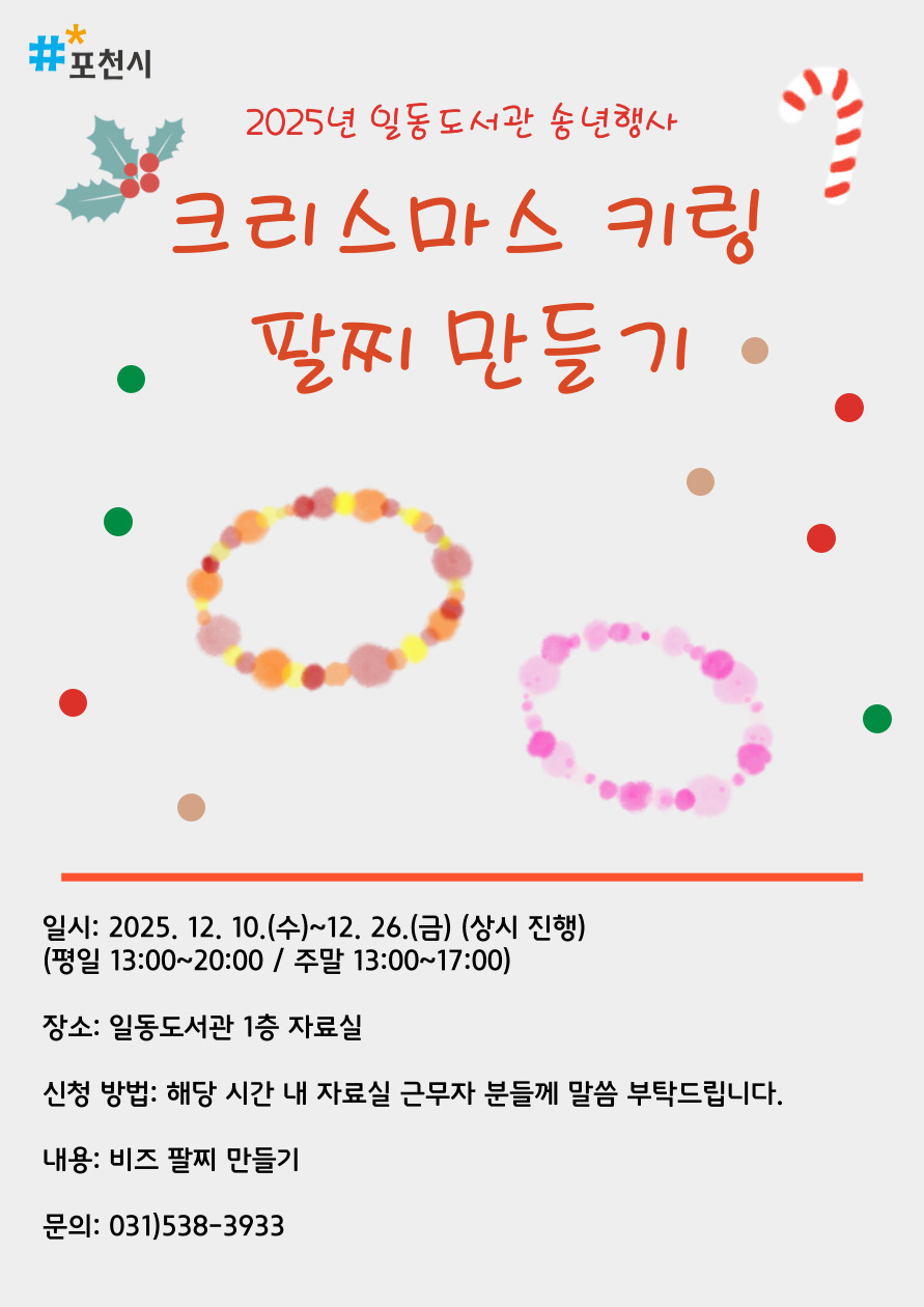 ![]() <일동도서관 송년행사 크리스마스 키링 팔찌 만들기 🎄> ○일시:25.12.10.(수)~12. 26.(금) 평일 13:00~20:00/주말 13:00~17:00, 모집 없이 상시 진행 ○장소:일동도서관 1층 자료실 ○신청 방법:해당 시간 내 자료실 근무자 분께 말씀 부탁드립니다 ○문의:031-538-3933 |