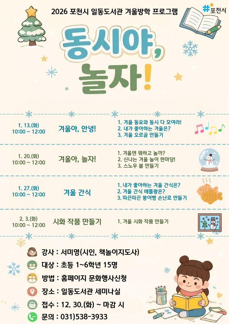 ![]() <일동도서관 겨울방학 프로그램 동시야 놀자! ❄> ○ 일시: 2026.1.13.(화)~2. 3.(화) 매주 화요일 10:00~12:00 ○ 장소: 일동도서관 1층 자료실 ○ 강사: 서미영 ○ 접수방법: 일동도서관 홈페이지 신청(선착순) ○ 문의 : 031-538-3933 ★ 1. 5.(월)까지 7일간 포천시민 우선 신청(이후 포천시민 외 접수 가능) ★ 접수 시 비고란에 거주 지역(읍/면/동까지) 작성 필수 |