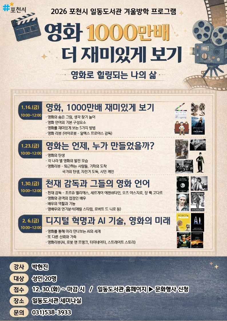![]() <일동도서관 겨울방학 프로그램 영화 1000만배 더 재미있게 보기 🎞> ○ 일시: 2026.1.16.(금)~2. 6.(금) 매주 금요일 10:00~12:00 ○ 장소: 일동도서관 1층 자료실 ○ 강사: 박현진 ○ 접수방법: 일동도서관 홈페이지 신청(선착순) ○ 문의 : 031-538-3933 ★ 1. 5.(월)까지 7일간 포천시민 우선 신청(이후 포천시민 외 접수 가능) ★ 접수 시 비고란에 거주 지역(읍/면/동까지) 작성 필수 |