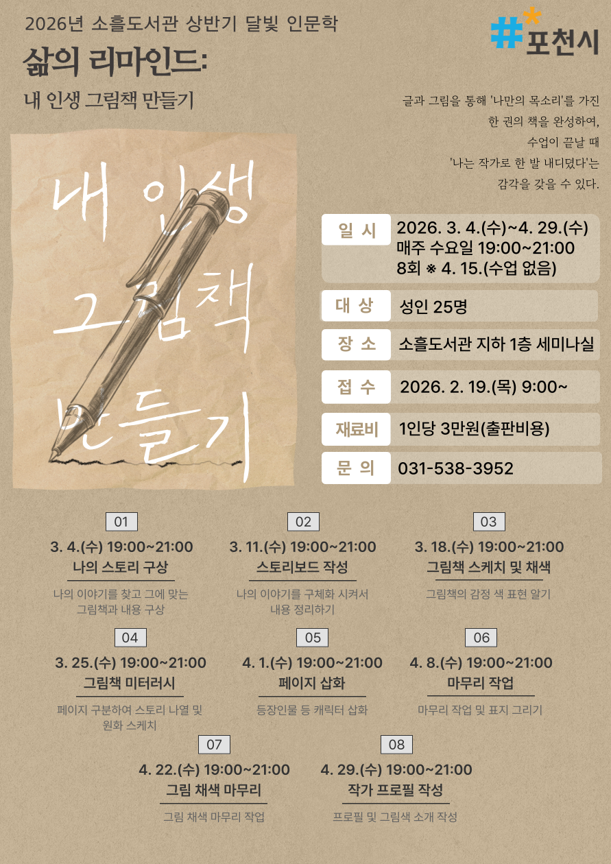 ![]() [2026 상반기 달빛 인문학] 삶의 리마인드: 내 인생 그림책 만들기 글과 그림을 통해 '나만의 목소리'를 가진 한 권의 책을 완성하여, 수업이 끝날 때 '나는 작가로 한 발 내디뎠다'는 감각을 갖을 수 있다. 일시: 2026. 3. 4.(수)~4. 29.(수) / 8회 대상: 성인 25명 장소: 세미나실 접수 / 문의: 2026. 2. 19.(목) 9:00~ 선착순 접수 / 538-3952 재료비: 1인당 3만원(출판비용) 1회차: 3. 4.(수) 19:00~21:00 - 나의 스토리 구상: 나의 이야기를 찾고 그에 맞는 그림책과 내용 구상 2회차: 3. 11.(수) 19:00~21:00 - 스토리보드 작성: 나의 이야기를 구체화 시켜서 내용 정리하기 3회차: 3. 18.(수) 19:00~21:00 - 그림책 스케치 및 채색: 그림책의 감정 색 표현 알기 4회차: 3. 25.(수) 19:00~21:00 - 그림책 미터러시: 페이지 구분하여 스토리 나열 및 원화 스케치 5회차: 4. 1.(수) 19:00~21:00 - 페이지 삽화: 등장인물 등 캐릭터 삽화 6회차: 4. 8.(수) 19:00~21:00 - 마무리 작업: 마무리 작업 및 표지 그릭 7회차: 4. 22.(수) 19:00~21:00 - 그림 채색 마무리: 마무리 작업 8회차: 4. 29.(수) 19:00~21:00 - 작가 프로필 작성: 프로필 및 그림책 소개 작성 ※반드시 읽어주세요 - 5일간 포천시민 우선 신청(이후 포천시민 외 접수 가능) |