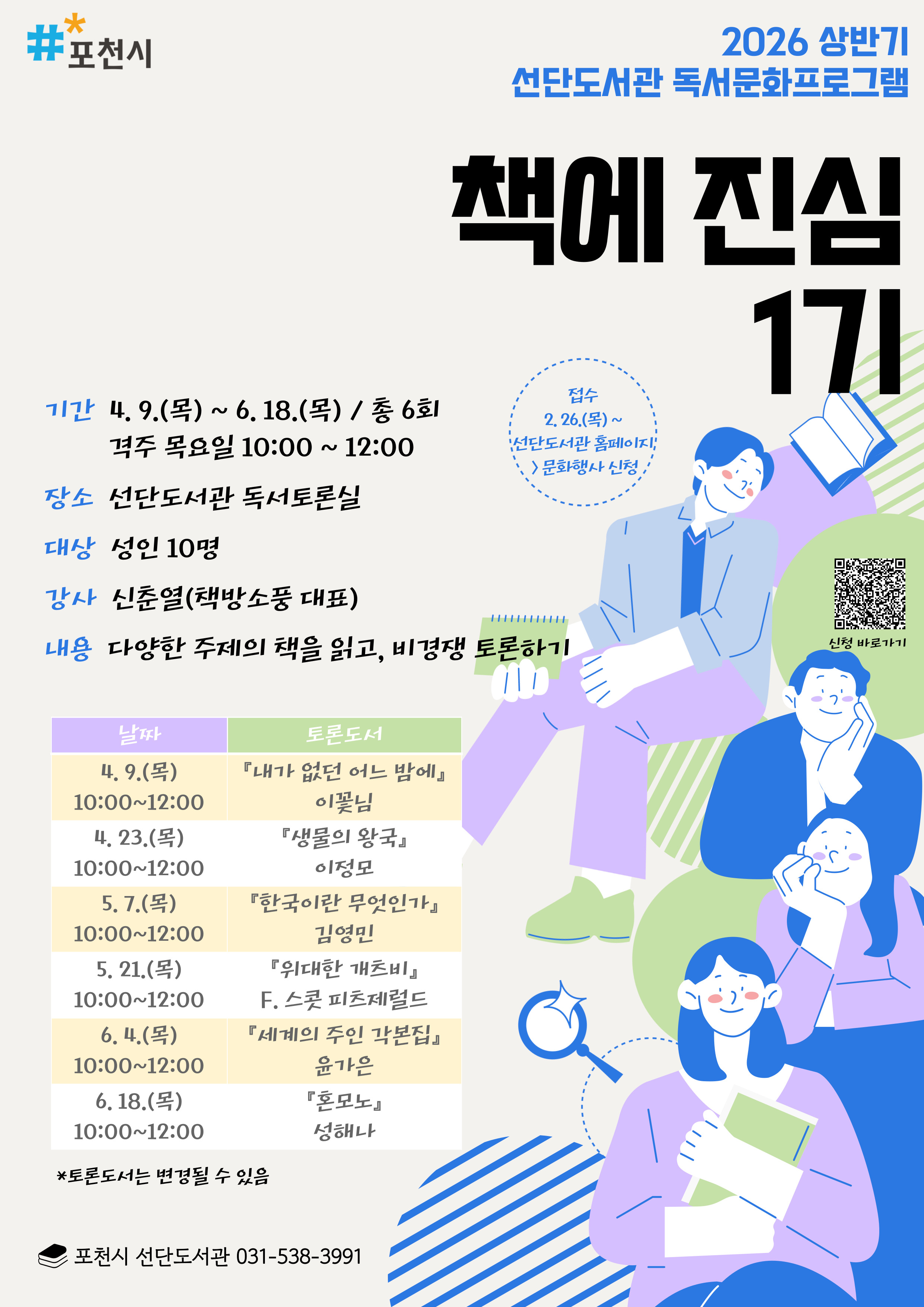 ![]() 《2026 상반기 선단도서관 독서문화프로그램》 ★ 책에 진심 1기 - 접수: 2026. 2. 26.(목) ~ 선단도서관 홈페이지 > 문화행사 신청 - 기간: 4. 9.(목) ~ 6. 18.(목) / 격주 목요일 10:00~12:00 / 총 6회 - 장소: 선단도서관 독서토론실 - 대상: 성인 10명 - 강사: 신춘열(책방소풍 대표) - 내용: 다양한 주제의 책을 읽고, 비경쟁 토론하기 - 토론도서 1차) 4. 9.(목) 10:00~12:00 / '내가 없던 어느밤에' 이꽃님 2차) 4. 23.(목) 10:00~12:00 / '생물의 왕국' 이정모 3차) 5. 7.(목) 10:00~12:00 / '한국이란 무엇인가' 김영민 4차) 5. 21.(목) 10:00~12:00 / '위대한 개츠비' F.스콧 피츠제럴드 5차) 6. 4.(목) 10:00~12:00 / '세계의 주인 각본집' 윤가은 6차) 6. 18.(목) 10:00~12:00 / '혼모노' 성해나 *토론도서는 변경될 수 있음. - 문의: 선단도서관 031-538-3991 ◀ 신청 시 주의사항 ▶ ★ 3. 2.(월)까지 5일간 포천시민만 신청 가능(이후 포천시민 외 가능) ★ 접수 시 비고란에 거주 지역(읍/면/동까지) 작성 필수 |