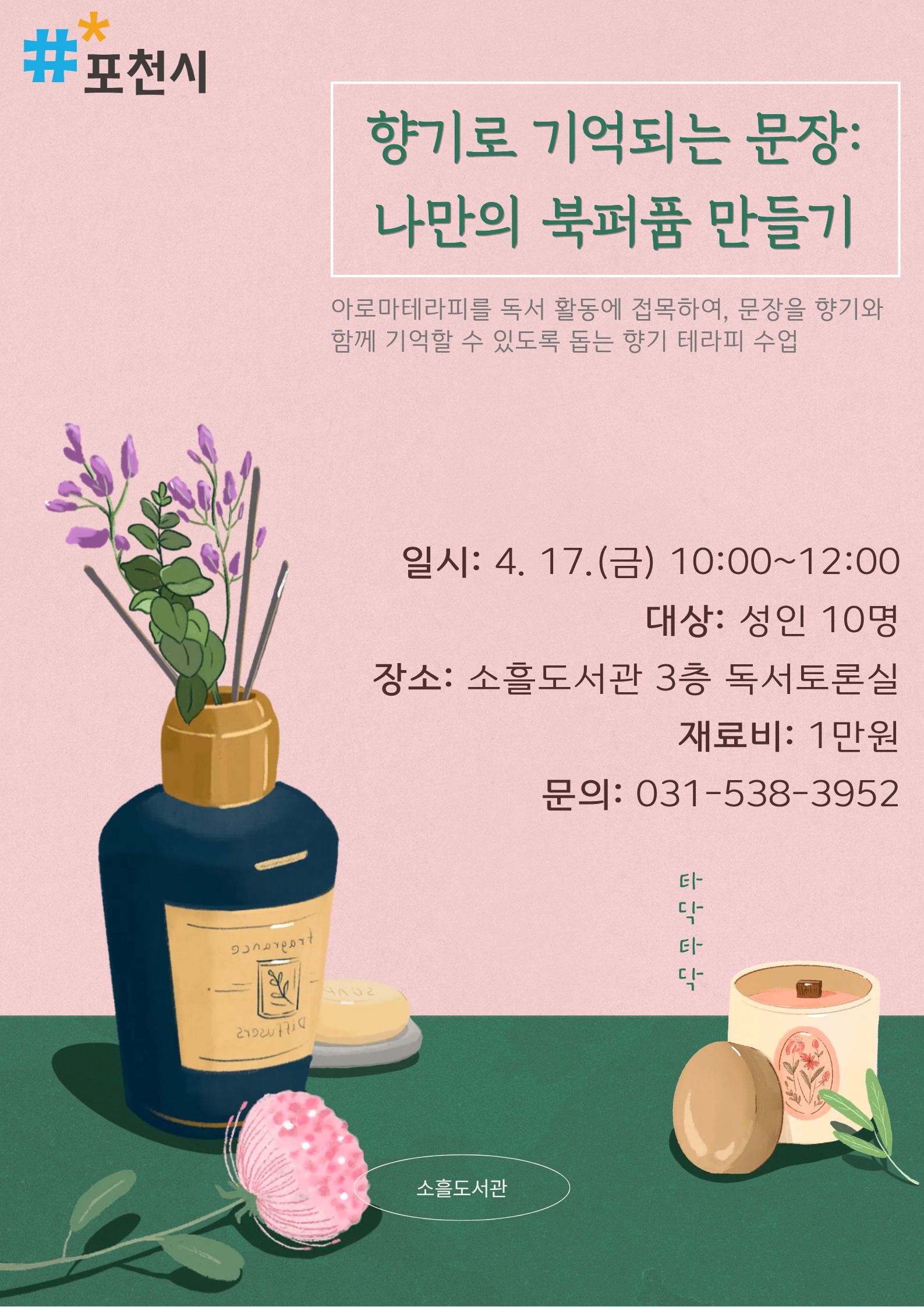 [2026 도서관주간] 향기로 기억되는 문장 : 나만의 북퍼퓸 만들기아로마테라피를 독서 활동에 접목하여, 문장을 향기와 함께 기억할 수 있도록 돕는 향기 테라피 수업 일시: 4. 17.(금) 10:00~12:00 대상: 성인 10명 장소: 소흘도서관 3층 독서토론실 재료비: 1만원 문의: 031-538-3952 ★신청 전, 반드시 읽어주세요★ - 5일 간 포천 시민 우선 신청(이후 포천시민 외 접수 가능 / 비고란에 포천시 거주 주소 적어주시기 바랍니다) - 도서관내 주차장이 협소하니 대중교통이나 도보이용 부탁드립니다. |