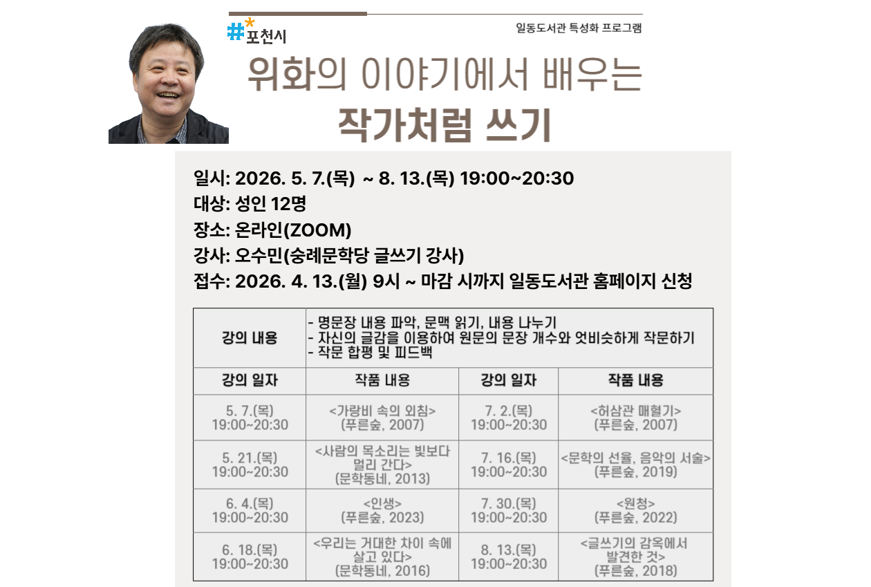 ○ 장소: 일동도서관 1층 세미나실 ○ 대상: 성인 12명 ○ 강사: 오수민(숭례문학당 글쓰기 강사) ○ 접수일시: 2026. 4. 13.(월) ~ 마감 시까지 ○ 접수방법: 일동도서관 홈페이지 접수(선착순) *문의: 일동도서관(031-538-3932) |