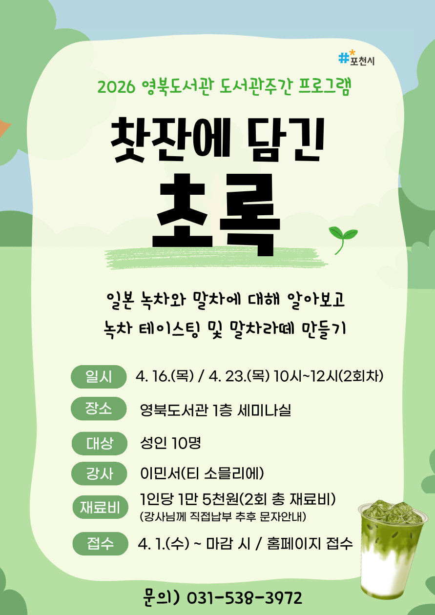 ![]() [2026년 도서관 주간] 찻 잔에 담긴 초록 - 일본 녹차와 말차에 대해 알아보고 녹차 테이스팅 및 말차라떼 만들기 * 일시: 4. 16.(목) ~ 4. 23.(목) 10시~12시 (매주 목요일, 총 2회) * 장소: 영북도서관 1층 세미나실 * 대상: 성인 10명 * 강사: 이민서(티 소믈리에) * 재료비: 1인당 1만 5천원(2회 총 재료비) ※ 강사님께 직접 납부, 추후 문자안내 드립니다. * 접수: 4. 1.(수) ~ 마감 시 / 영북도서관 홈페이지 접수 * 문의: 031-538-3972 ※ 신청 시 주의사항(필독!!) * 4. 5.(일)까지 포천시민 우선 신청 기간(이후 포천시민 외 접수 가능) - 접수 시, 비고란에 거주지역(읍/면/동까지) 작성 필수 * 재료비가 있는 프로그램의 경우 - 입금 후 환불 불가능 - 사전 연락 없이 불참시 재료 보관이 어려우며, 2주 보관 후 폐기(1층 데스크에서 수령) - 다만 소분이 어려운 재료일 경우, 별도 보관이나 수령이 어려움 |
