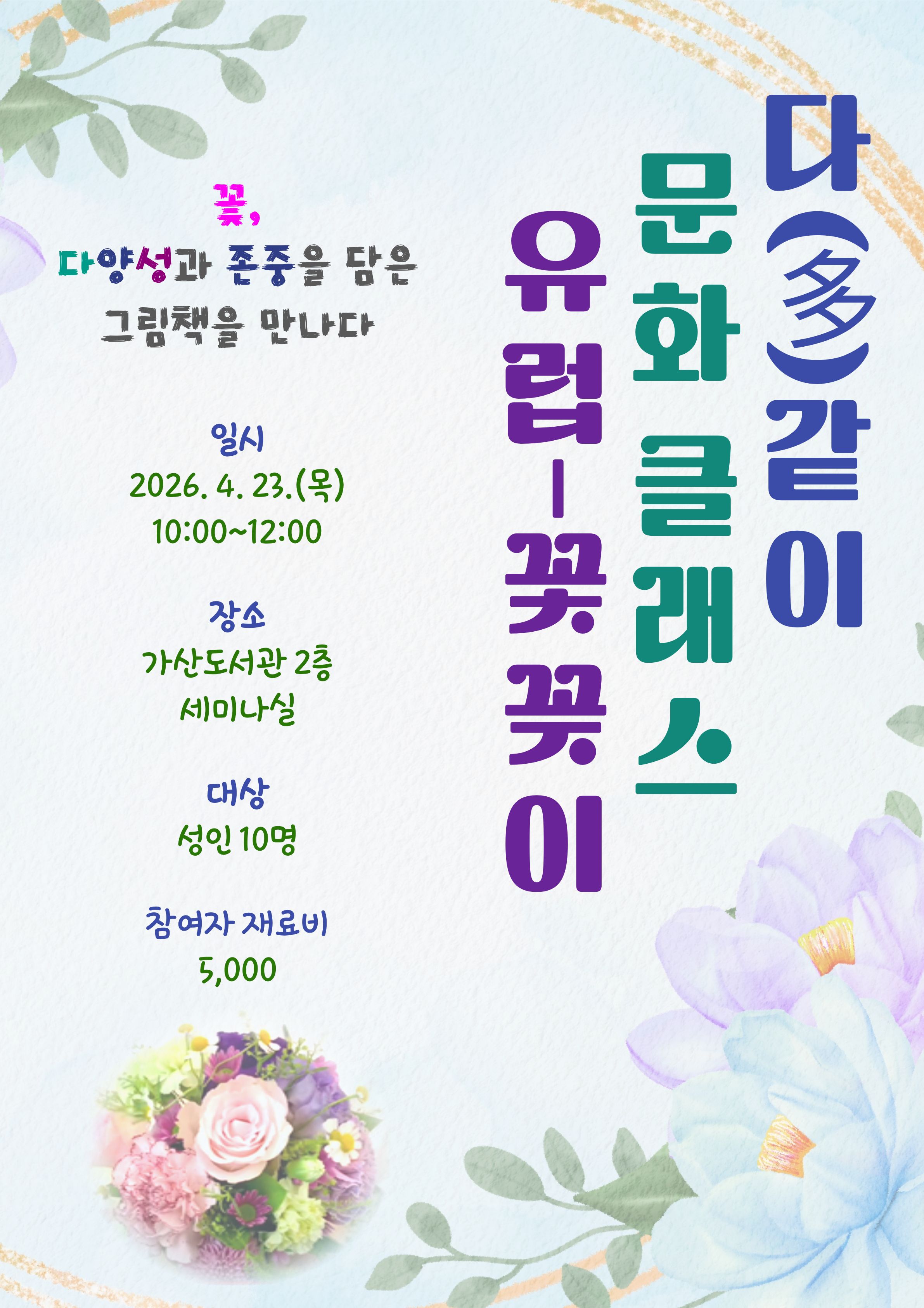 | 2026년 가산도서관 도서관주간 프로그램 '다(多)같이 문화 클래스: 유럽-꽃꽂이' - 그림책 동화를 감상하고 유러피안 꽃꽂이 체험하기