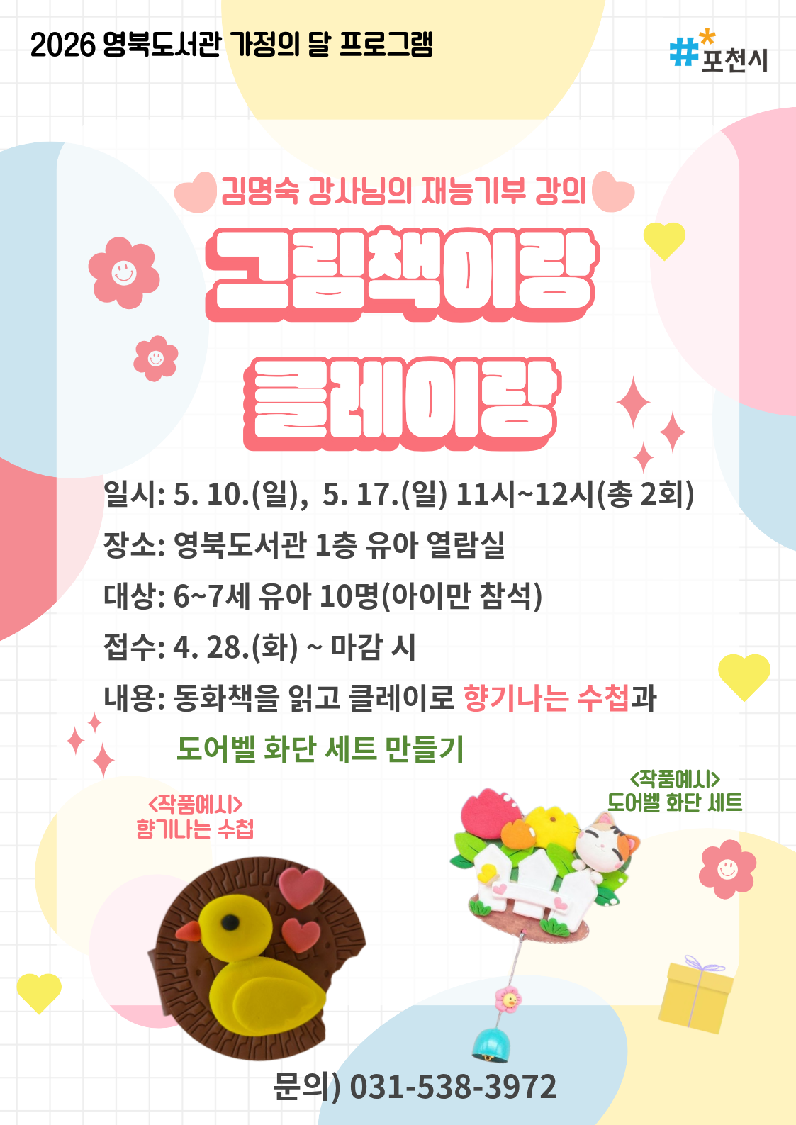 | ★김명숙 강사님의 재능기부 강의 입니다★ 강사님의 소중한 재능기부를 통해 무료로 진행되는 강의이며, 준비한 재료의 수량이 한정되어있음을 미리 안내드립니다. ![]() <2026 영북도서관 가정의 달 프로그램> 그림책이랑 클레이랑(유아대상) - 일시: 5. 10.(일), 5. 17(일) 매주 일요일 11시~12시(총 2회) - 장소: 영북도서관 1층 유아 열람실 - 대상: 6~7세 유아 10명(아이만 참석) - 접수: 4. 28.(화) ~ 마감 시 - 내용: 동화책을 읽고 클레이를 활용하여 향기나는 수첩과 도어벨 화단 세트 만들기 - 문의: 031-538-3972 ※ 프로그램 신청 전 안내사항 * 5. 2.(토)까지 5일간 포천시민 우선 신청 기간 입니다.(이후 포천시민 외 접수 가능) * 접수 시 비고란에 거주지역(읍/면/동까지) 작성 필수 * 프로그램 취소 시, 대기자분들을 위하여 홈페이지에서 취소 또는 031-538-3972로 연락부탁드립니다. |