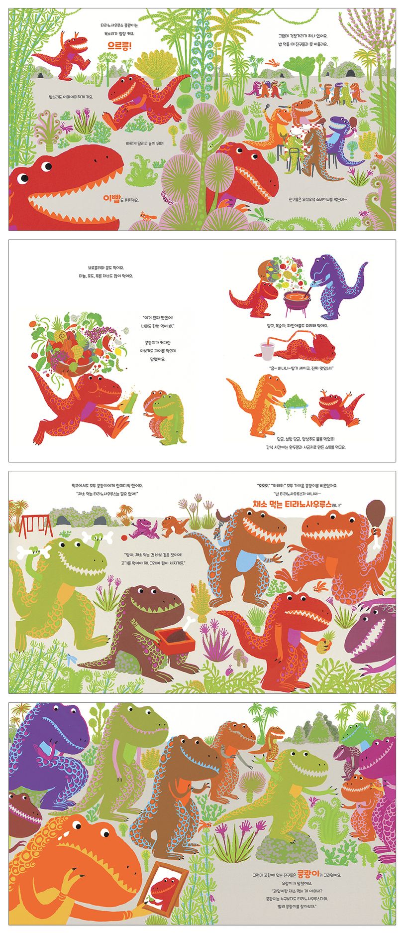 스므리티 프라사담 홀스 작가는 ‘채소 먹는 티라노사우루스가 독특한 이유’를 기발하고 천연덕스럽게 풀어내고 있습니다. 쿵쾅이와 친구들이 서로를 이해하게 되는 과정을 그리면서 다른 점은 결코 ‘틀린’ 것이 아니라 그냥 ‘다른’ 것임을 자연스럽게 보여 줍니다.