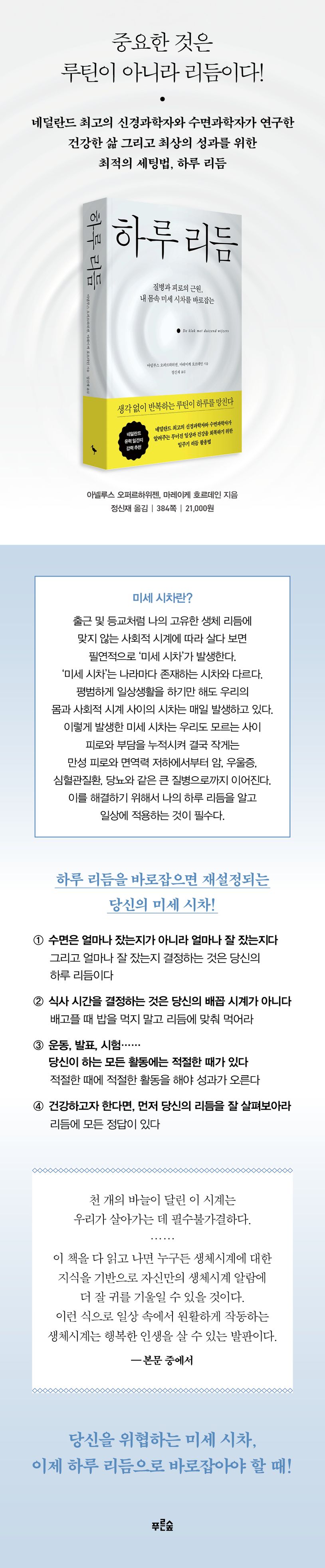 도서출판 푸른숲에서 자신만의 일주기 리듬을 찾아서 일상 속 피로와 질병을 해결하는 《하루 리듬》을 출간했다. 시간생물학과 수면과학을 연구하는 저자들은 노벨의학상을 받은 일주기 리듬 이론을 바탕으로 수면, 건강, 운동, 성과 등 우리의 하루는 생체시계가 결정한다고 말한다.