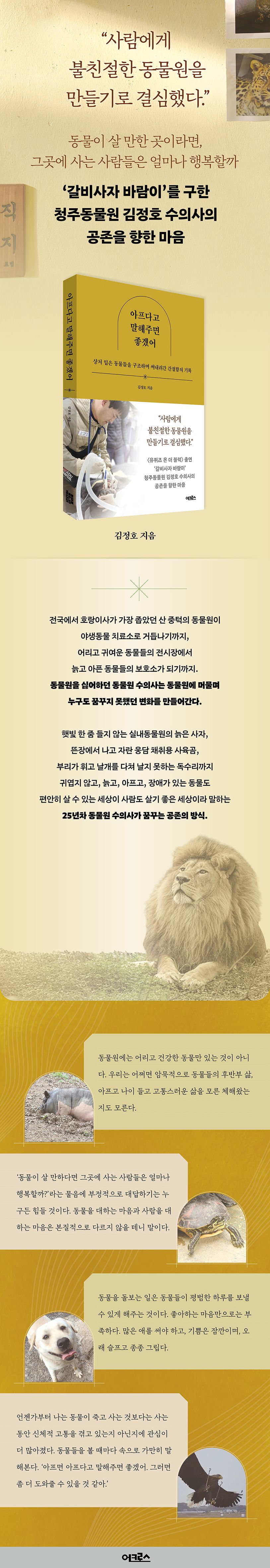 햇빛 한 줌 들지 않는 실내 동물원의 늙은 사자, 뜬장에서 나고 자란 웅담 채취용 사육곰, 날개를 다쳐 날지 못하는 독수리…. 김정호 수의사는 아파도 아프다고 말하지 않는 야생동물을 구조하고 치료해 야생 복귀를 돕고, 자연으로 돌아갈 수 없는 동물은 동물원에서 편안한 여생을 보내도록 애쓴다. 그의 글은 자신이 추구하는 가치를 위해 묵묵히 헌신하는 사람만이 줄 수 있는 묵직한 감동을 선사하는 동시에 돌봄과 책임, 공존의 의미를 되새겨보게 한다.