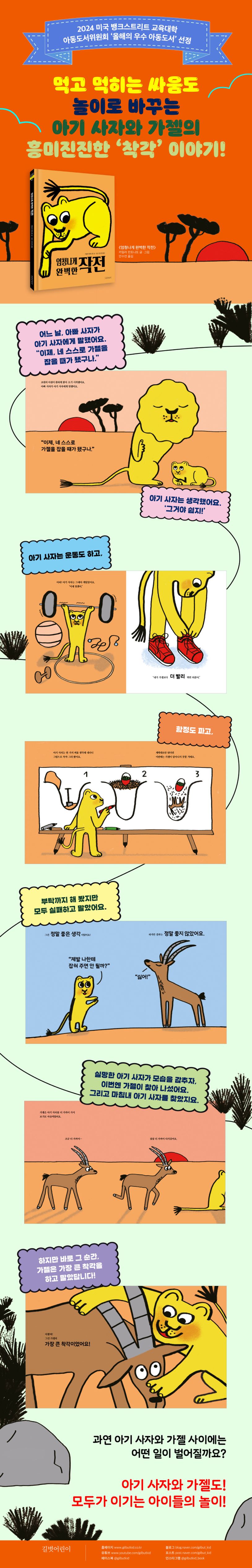 어느 날, 아빠 사자가 아기 사자에게 말했어요. “이제, 네 스스로 가젤을 잡을 때가 됐구나.” 아기 사자는 ‘그거야 쉽지!’라고 생각하며 첫 사냥에 나섰어요. 덤불 뒤에 몸을 숨기고, 엉덩이를 씰룩이며 기회를 노리던 아기 사자 앞에 가젤이 나타났지만, 가젤은 쌩~ 하고 달아나 버렸지요. 아기 사자는 가젤을 잡기 위해 운동화를 신어도 보고, 함정을 파고, 심지어 정중하게 부탁도 해봤지만, 결과는 번번이 실패! 게다가 다른 가젤들까지 몰려와 아기 사자를 보고 비웃자, 상처받은 아기 사자는 모습을 감춰 버렸어요. 처음에는 홀가분하고 우쭐했던 가젤도 아기 사자가 보이지 않자 점점 신경이 쓰였어요. 그래서 아기 사자를 찾으러 다녔지요. 그러다가 초원 한가운데에서 덩그러니 앉아 있는 아기 사자를 찾았어요. 가젤이 슬금슬금 아기 사자에게 다가간 순간, 뜻밖의 일이 벌어졌어요! 아기 사자와 가젤 사이에는 어떤 일이 벌어진 걸까요?