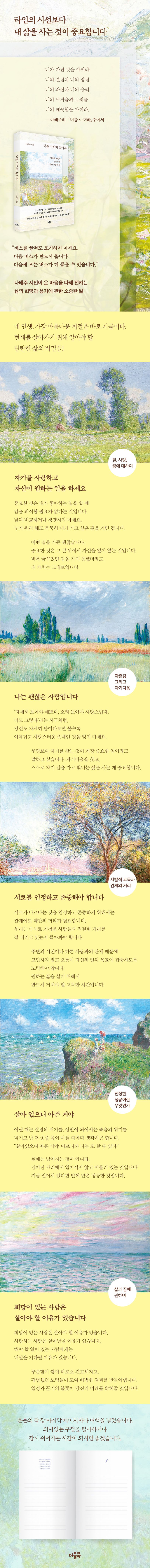 이 책을 읽다 보면 온 마음을 다해 사랑으로 나를 위해 아낌없이 모든 인생의 지혜를 다 내어주고 싶어 하는 노시인의 간절하고 따뜻한 마음을 느낄 수 있다.