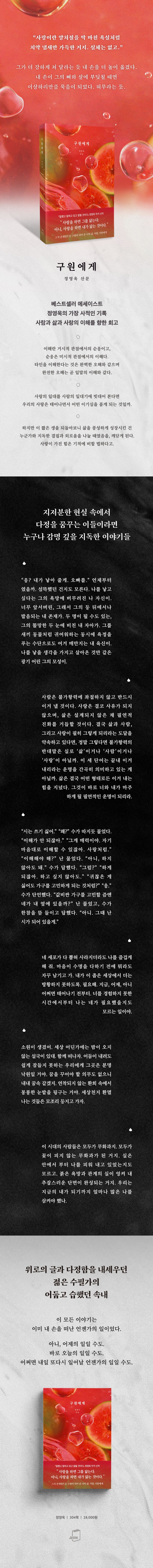 『잘했고 잘하고 있고 잘될 것이다』, 『잔잔하게 그러나 단단하게』, 『참 애썼다 그것으로 되었다』 등 여러 베스트셀러를 선보인 독보적 에세이스트 정영욱 작가가 약 2년 만에 신작 『구원에게』로 돌아왔다. 이번 책에서 작가는 그간 이어 온 위로의 결에서 물러나, 사랑이 남긴 상처와 균열, 어두운 구석에 남겨 두었던 감정의 잔여들까지 덜어 내지 않고 담담히 써 내려간다.