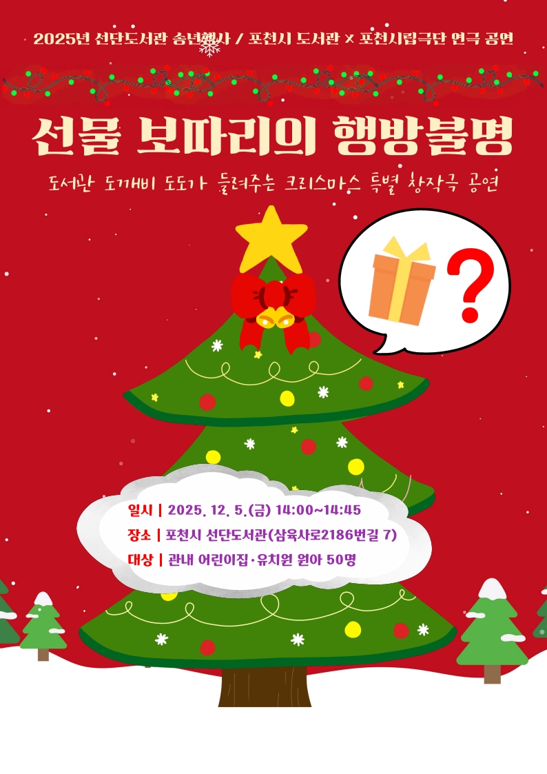 | 강좌명 | [2025 송년행사] 선단도서관 X 포천시립극단 크리스마스 특별 공연 '선물보따리의 행방불명'(관내 어린이집 및 유치원) |