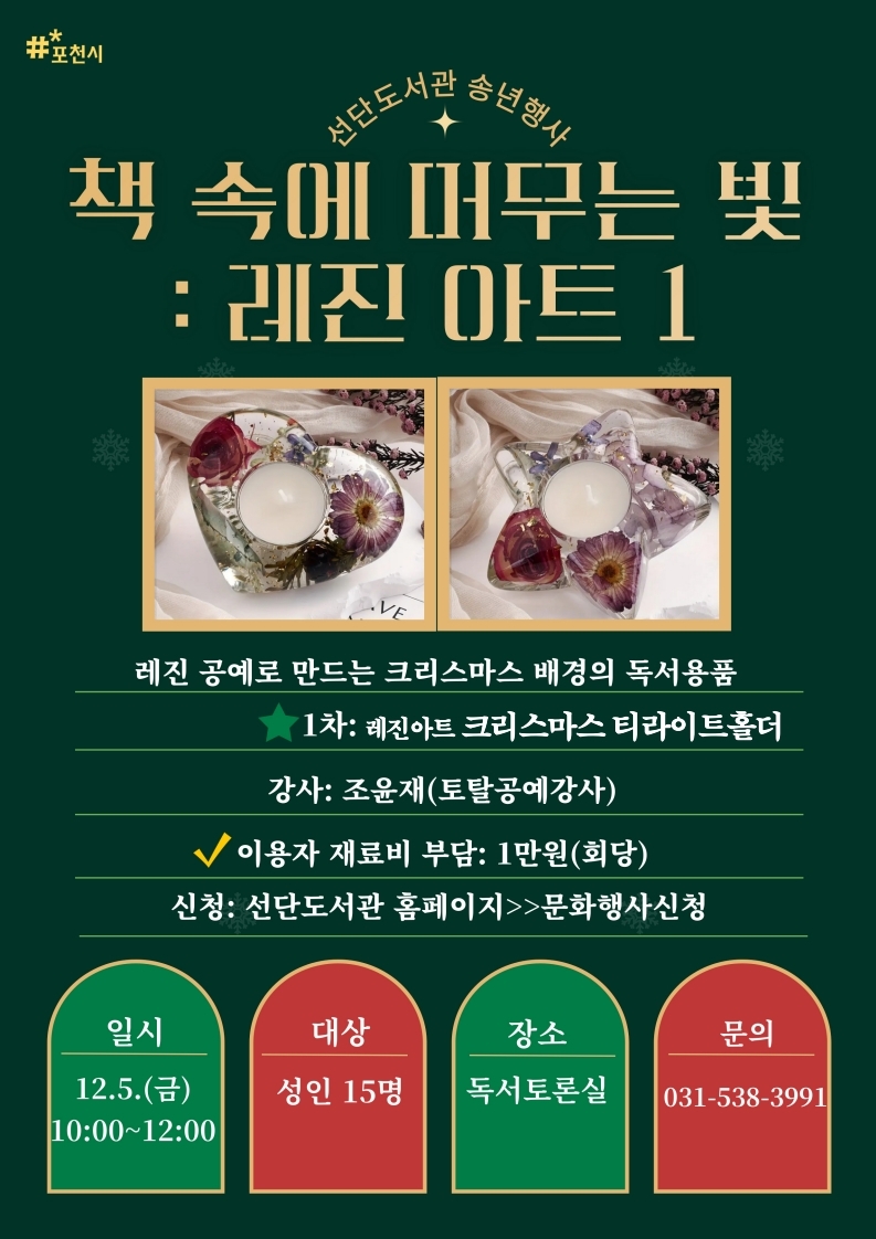 | [기존의 크리스마스 배경의 문진이 「크리스마스 배경 티라이트 홀더」로 변경되었습니다. 안내에 혼선을 드려 죄송합니다.] 선단도서관에서 송년을 맞이하여 '책 속에 머무는 빛: 레진아트' 프로그램을 운영할 예정이오니, 많은 관심 바랍니다. ![]() (2025년 선단도서관 송년행사) 책 속에 머무는 빛: 레진아트 - 1차: 크리스마스 배경의 레진 티라이트 홀더 만들기 ◆ 강의 신청 시 유의사항 - 참여자 부담 재료비: 1인 1차시당 10,000원 - 접수 시작일로부터 5일간은 포천시민만 신청이 가능합니다. - 신청기한[2025. 12. 3.(수)]까지 홈페이지 신청과 참여자 재료비가 모두 납입되어야 최종 신청 접수가 완료됩니다. - 납입계좌는 향후 문자로 안내드릴 예정입니다. - 신청기한 이후에 재료비 납입이 확인되지 않을 경우, 자동으로 신청이 취소될 수 있습니다. - 재료비 납입 후에는 강의를 위한 재료를 바로 구매하므로 환불이 불가하오니 참고하시기 바랍니다. ◆ 강의일시: 2025. 12. 5.(금) 10:00~12:00 ◆ 강의장소: 선단도서관 독서토론실 ◆ 신청대상: 성인 15명 ◆ 강사: 조윤재(토탈공예강사) ◆ 납입계좌: 향후 문자안내 예정 ◆ 신청문의: 031-538-3991 |