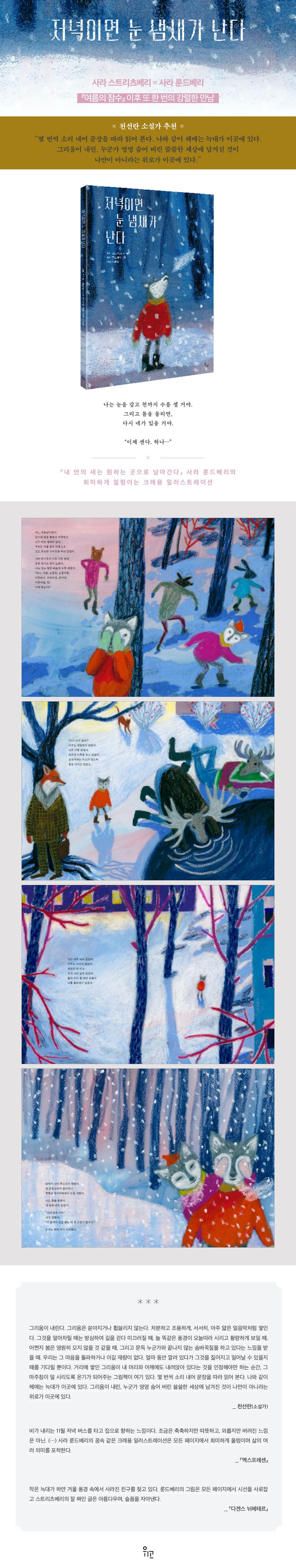 두 사람이 다시 만난 그림책 『저녁이면 눈 냄새가 난다』는 한겨울 천진한 숨바꼭질 놀이를 통해 상실과 그리움을 그려내는 동시에, 상실의 과정에 있을 때 비로소 보이는 삶의 숨겨진 의미들을 담아내고 있다. 사라 스트리츠베리는 상실 속에서도 삶은 계속되며, 무언가를 찾고 있을 때 끝내 그것을 찾아내지는 못할지라도 예상치 못한 다른 것을 만나게 되기도 한다는 것을 함축적으로 표현한다. 삶의 여러 장면들을 눈에 담고 그 숨겨진 의미의 일단을 붙드는 일은 상실 속에서만 일어나는 일일지 모른다는 깨달음에 좀처럼 가시지 않는 여운이 남는다.