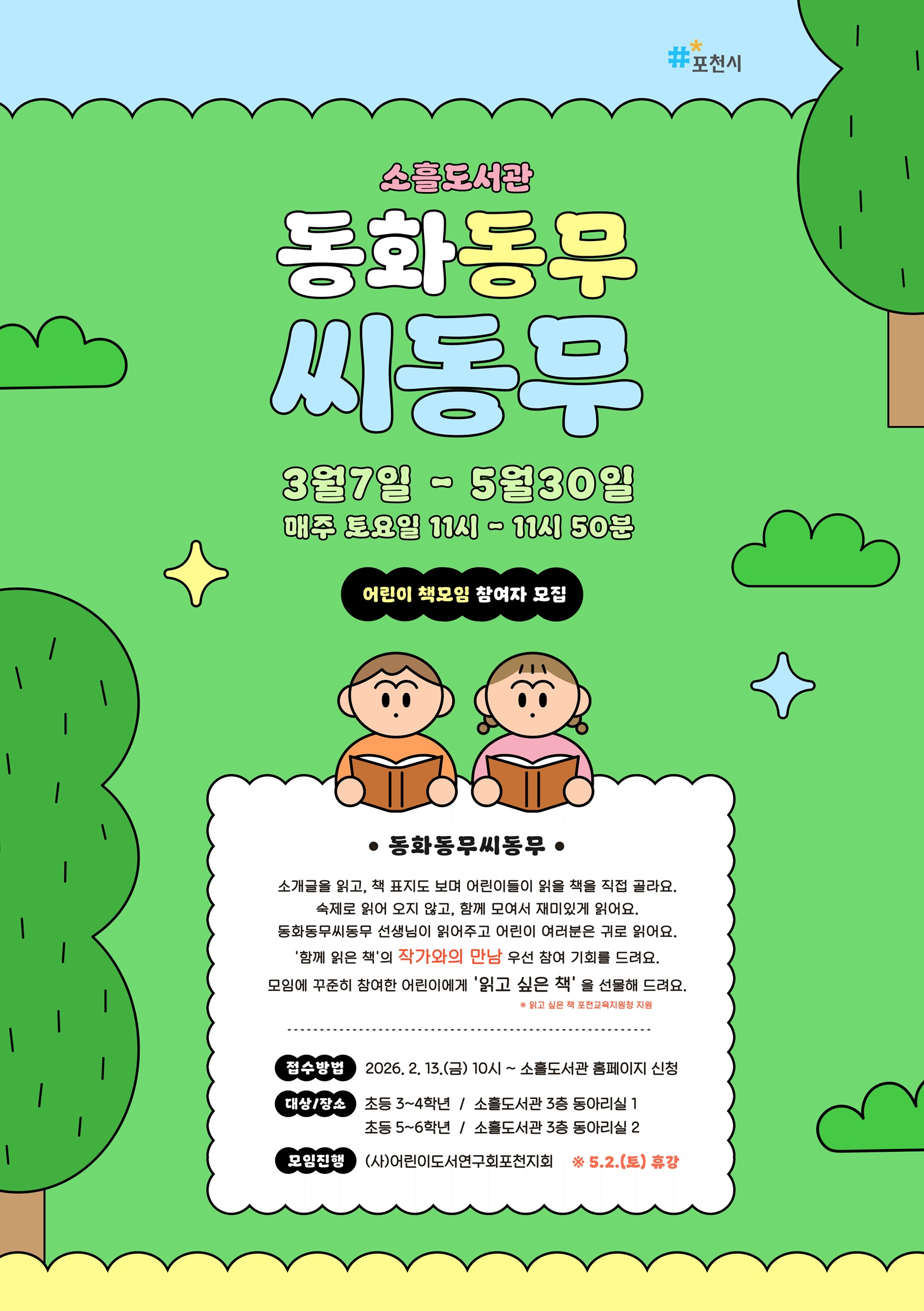 <동화동무씨동무> º 소개글을 읽고, 책 표지도 보며 어린이들이 읽을 책을 직접 골라요. º 숙제로 읽어 오지 않고, 함께 모여서 재미있게 읽어요. º 동화동무씨동무 선생님이 읽어주고 어린이 여러분은 귀로 읽어요. º '함께 읽은 책'의 작가와의 만남 우선 참여 기회를 드려요. º 모임에 꾸준히 참여한 어린이에게 '읽고 싶은 책'(포천교육지원청 지원)을 선물해드려요. - 기간: 3월 7일부터 5월 30일까지 (매주 토요일) 11시~11시 50분 * 단, 5. 2.(토) 휴강 - 접수방법: 2026. 3. 13.(금) 10시~소흘도서관 홈페이지>문화행사신청 - 대상/장소 ▶ 초등 3~4학년/소흘도서관 3층 동아리실1 ▶ 초등 5~6학년/소흘도서관 3층 동아리실2 - 모임진행: (사)어린이도서연구회포천지회 - 문의: 소흘도서관 프로그램 담당자 031-538-3953 ★ 2. 18.(수)까지 5일간 포천시민 우선 신청(이후 포천시민 외 접수 가능) ★ 접수 시 비고란에 거주 지역(읍/면/동까지) 작성 필수 |