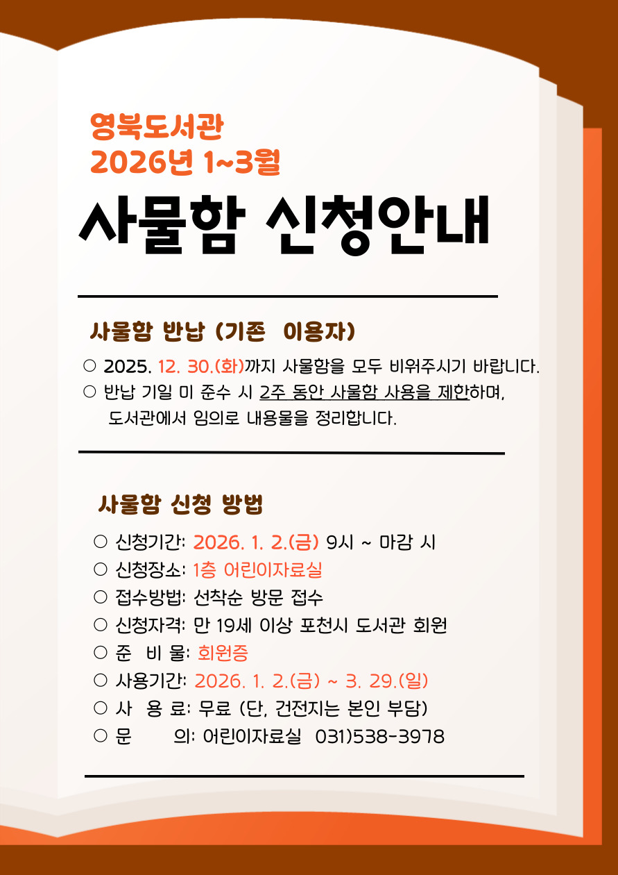 ![]() 영북도서관 2026년 1~3월 사물함 신청안내 사물함 반납 (기존 이용자) ○2025. 12. 30.(화)까지 사물함을 모두 비워주시기 바랍니다. ○반납 기일 미 준수 시 2주 동안 사물함 사용을 제한하며, 도서관에서 임의로 내용물을 정리합니다. 사물함 신청 방법 ○신청기간: 2026. 1. 2.(금) 9시 ~ 마감 시 ○신청장소: 1층 어린이자료실 ○접수방법: 선착순 방문 접수 ○신청자격: 만 19세 이상 포천시 도서관 회원 ○준 비 물: 회원증 ○사용기간: 2026. 1. 2.(금) ~ 3. 29.(일) ○사 용 료: 무료 (단, 건전지는 본인 부담) ○문 의: 어린이자료실 031)538-3978 |